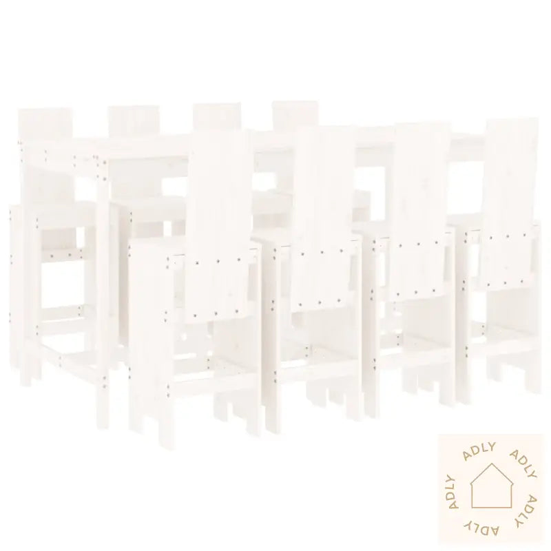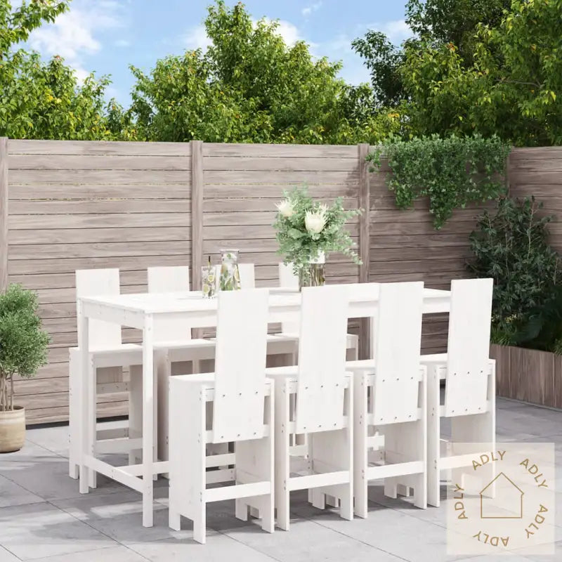 For å holde dine utemøbler fine år etter år, anbefaler vi å bruke et vanntett trekk som beskytter mot vær og vind.Farge: hvitMateriale: heltre furuMål barbord: 203,5 x 90 x 110 cm (L x B x H)Mål barkrakk (hver): 40 x 42 x 120 cm (L x B x H)Maksimal lastekapasitet (per sete): 110 kgMontering kreves: jaLeveransen inneholder:1 x hagebord8 x barkrakker