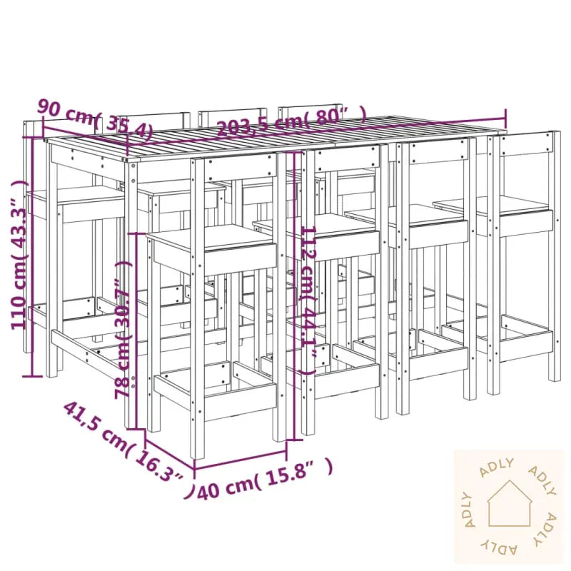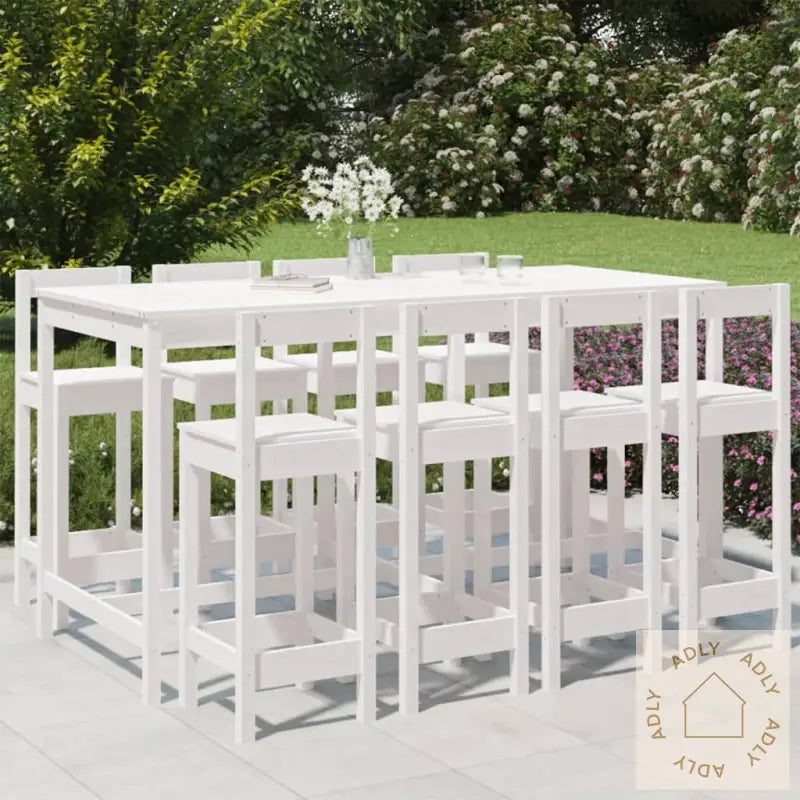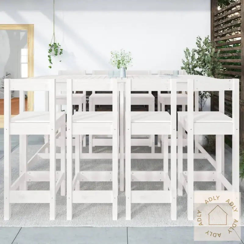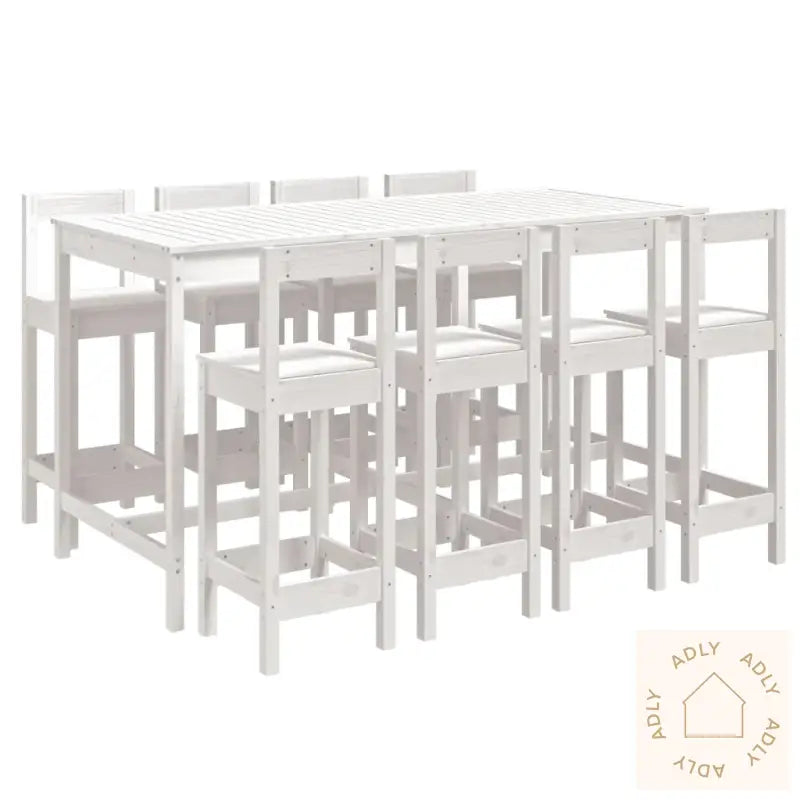 For å bevare det stilrene utseendet til dine utendørs møbler, anbefales det å bruke et vanntett trekk som beskyttelse mot vær og vind.Farge: HvitMateriale: Heltre furuMål barbord: 203,5 x 90 x 110 cm (B x D x H)Mål barstol (hver): 40 x 41,5 x 112 cm (L x B x H)Maksimal lastekapasitet (per sete): 110 kgMontering kreves: JaLeveransen inkluderer:1 x barbord8 x barstoler