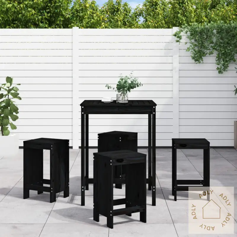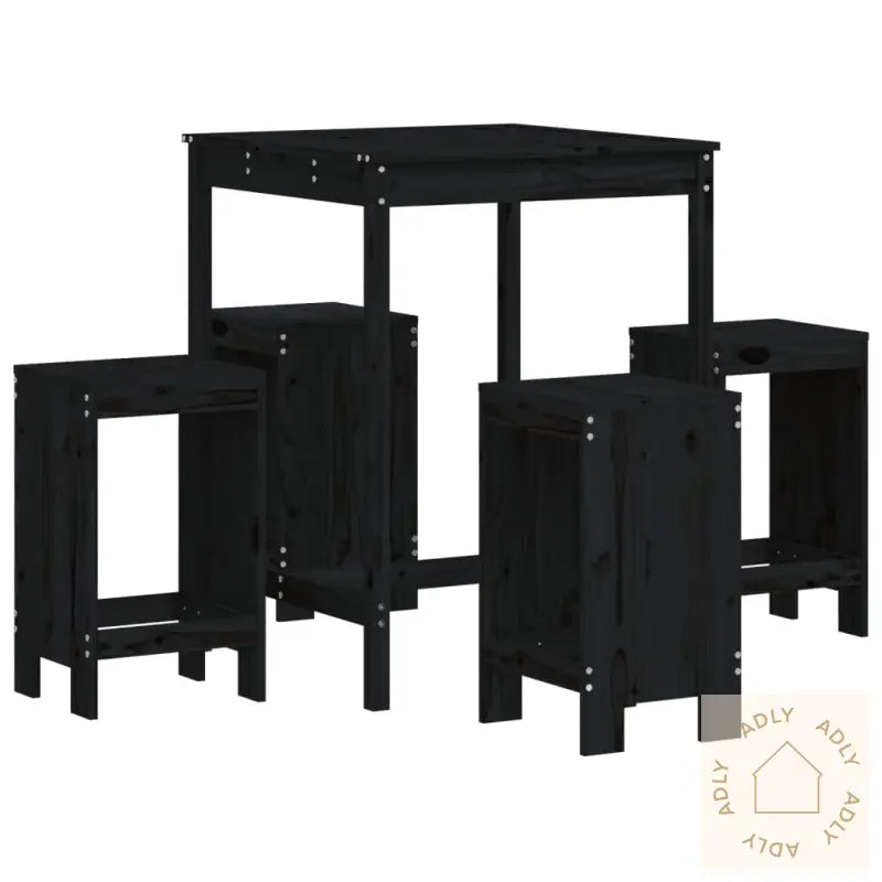 For å bevare dine nye hagemøbler i heltre furu lengst mulig, anbefaler vi å bruke et vanntett trekk når de ikke er i bruk.Farge: svartMateriale: heltre furuMål hagebord: 82,5 x 82,5 x 110 cm (L x B x H)Mål barkrakk (hver): 40 x 36 x 75 cm (L x B x H)Maksimal lastekapasitet (per sete): 110 kgMontering kreves: jaLeveransen inneholder:1 x hagebord4 x barkrakker