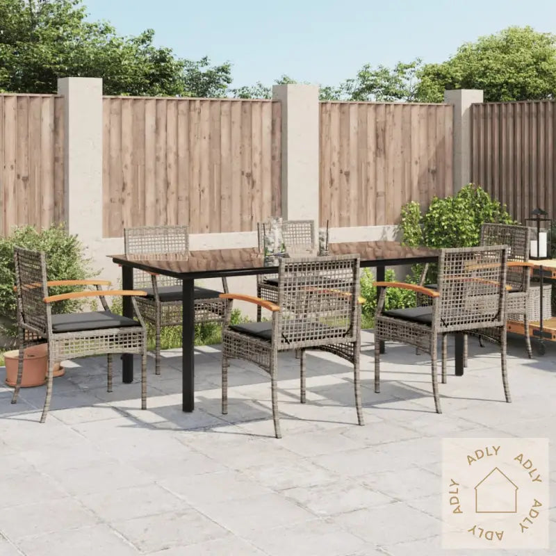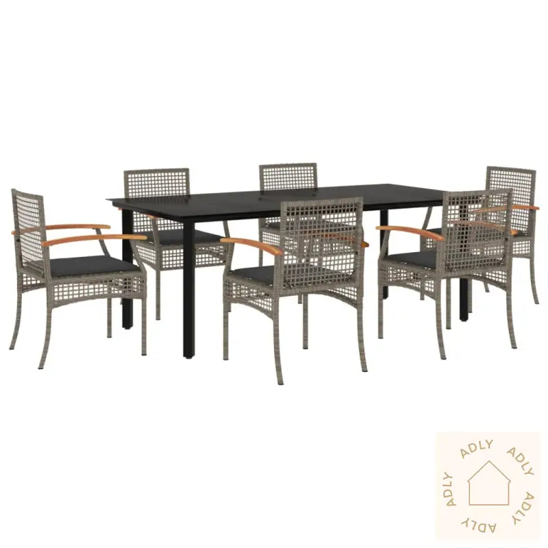 For å bevare utseendet og kvaliteten på dine hagemøbler anbefaler vi å bruke et vanntett trekk i perioder med mye regn eller når møblene ikke er i bruk.Maksimal lastekapasitet (per sete): 110 kgUV-bestandig, for ekstra beskyttelse mot solblekingMontering kreves: jaBord:Farge: svartMaterialer: pulverlakkert stål, herdet glassMål: 200 x 100 x 74 cm (L x B x H)Stol:Farge: gråMaterialer: PE-rotting, pulverlakkert stål, heltre akasie med oljefinishMål: 54 x 57 x 85 cm (B x D x H)Mål sete: 46,5 x 49 cm (B x D)Høyde sete fra bakken: 42,5 cmHøyde armlene fra bakken: 59,5 cmPute:Farge: mørkegråMateriale trekk: stoff (100% polyester)Materiale fyll: skumMål benkpute: 100 x 48 x 3 cm (B x D x T)Mål stolpute: 46 x 48 x 3 cm (B x D x T)Leveransen inneholder:1 x hagebord6 x hagestoler6 x stolputer med avtagbart og vaskbart trekk