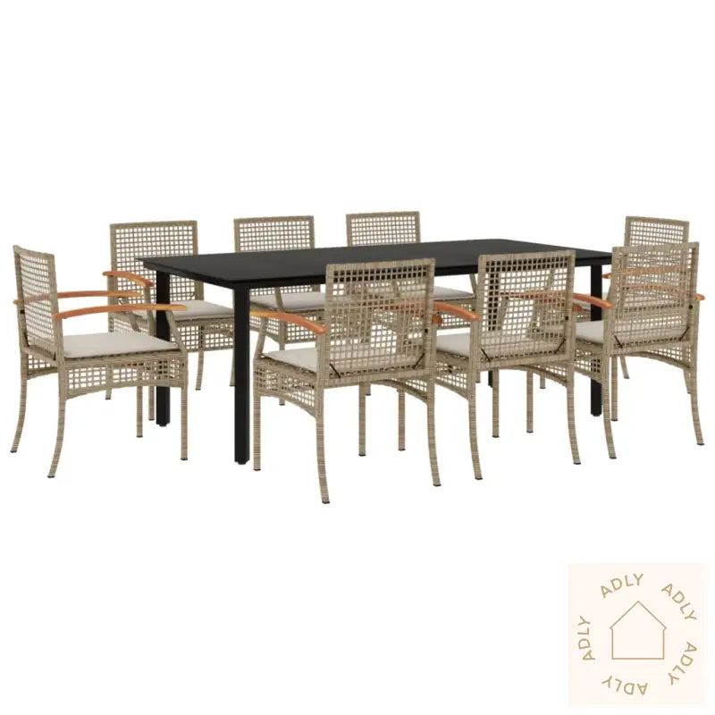 For å ivareta kvaliteten på hagemøblene dine og holde dem fine over tid, anbefaler vi å bruke et vanntett trekk når de ikke er i bruk.Maksimal lastekapasitet per sete: 110 kgUV-bestandigMontering kreves: jaBord:Farge: svartMaterialer: pulverlakkert stål, herdet glassMål: 200 x 100 x 74 cm (L x B x H)Stol:Farge: beigeMaterialer: PE-rotting, pulverlakkert stål, heltre akasie med oljefinishMål: 54 x 57 x 85 cm (B x D x H)Mål sete: 46,5 x 49 cm (B x D)Høyde sete fra bakken: 42,5 cmHøyde armlene fra bakken: 59,5 cmPute:Farge: kremhvitMateriale trekk: stoff (100% polyester)Materiale fyll: skumMål stolpute: 46 x 48 x 3 cm (B x D x T)Leveransen inneholder:1 x hagebord8 x hagestoler8 x seteputer med avtagbart og vaskbart trekk