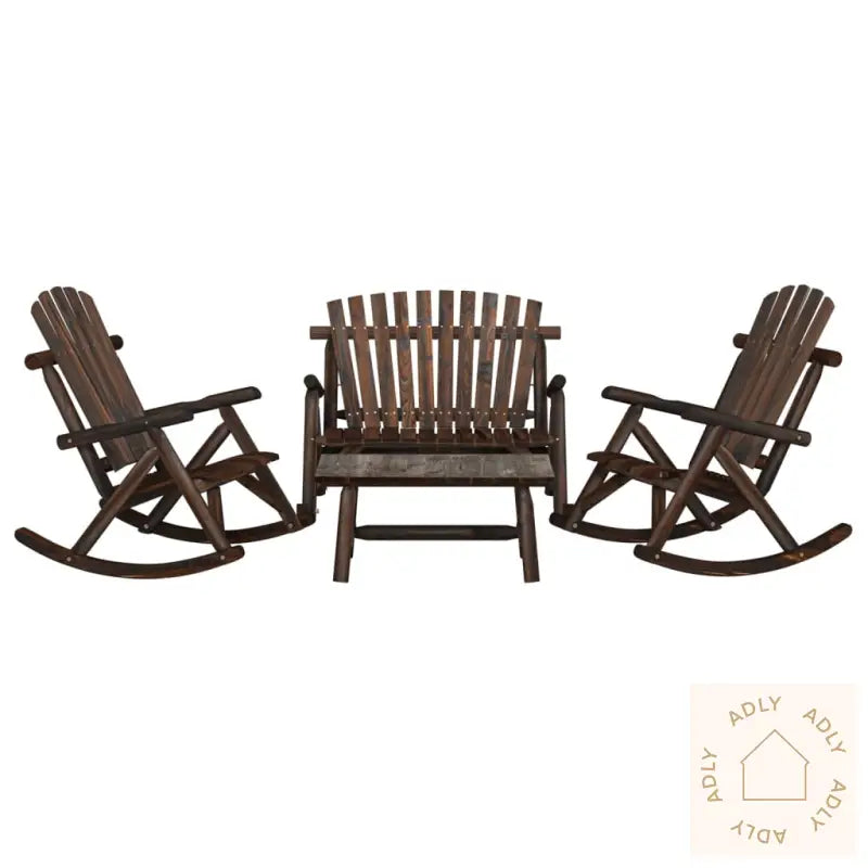 Heltre gran: Dette hagemøbelsettet er laget av heltre gran som sørger for en solid konstruksjon og lang levetid. Det robuste trematerialet har et brent utseende, som gir ekstra karakter og en unik stil.Gyngende design: Slapp helt av mens du nyter den rolige gyngende bevegelsen i både stoler og benker. Perfekt for sene sommerkvelder eller helgefrokoster ute!Komfortabel sitteopplevelse: Sittestillingene har gjennomtenkt ergonomisk design med buede seter, brede armlener og ryggstøtter i Adirondack-stil. Du får god støtte og kan lene deg komfortabelt tilbake etter en travel dag. Sjekk tekniske detaljer som dybde sete, bredde sete og høyde ryggstøtte for å finne ut hvor mye du kan slappe av.Praktisk bordplate: Den solide bordplaten passer perfekt til å servere mat, drikke og snacks, enten du har familiegrill eller inviterer venner på besøk.Godt å vite: