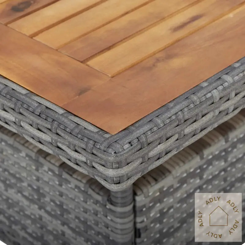 Spisestuesettet er konstruert med en solid, pulverlakkert stålramme, kledd i håndvevd, værbestandig PE-rotting. Den sterke rammen sørger for solide og stabile møbler, mens rottingen gir et moderne og innbydende uttrykk som tåler norske værforhold gjennom hele året. Bordplaten er laget av heltre akasie med vakker oljefinish – et slitesterkt og naturlig materiale kjent for lang levetid og unikt utseende. Ingen bord blir like, takket være de flotte årringene i treverket.