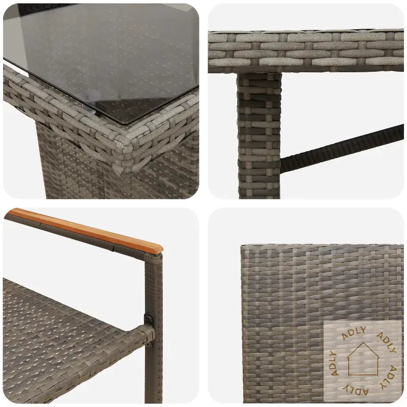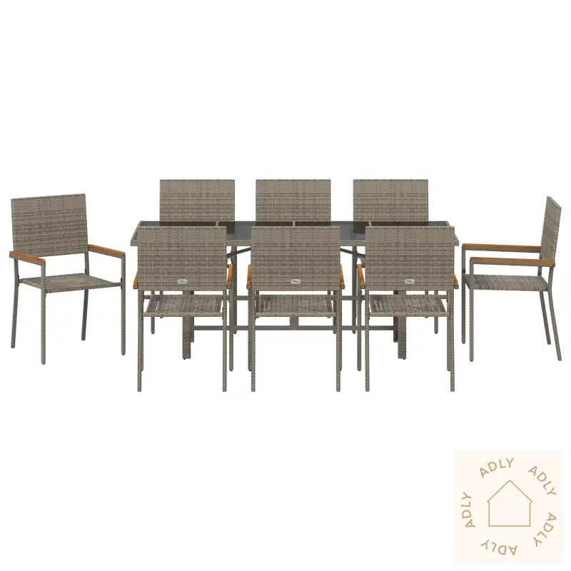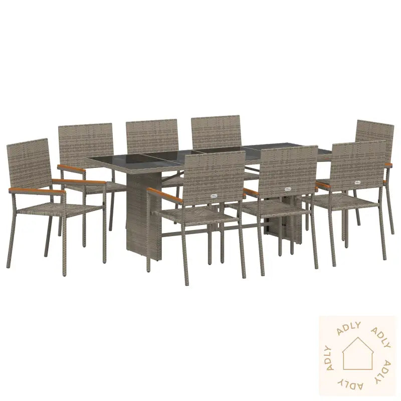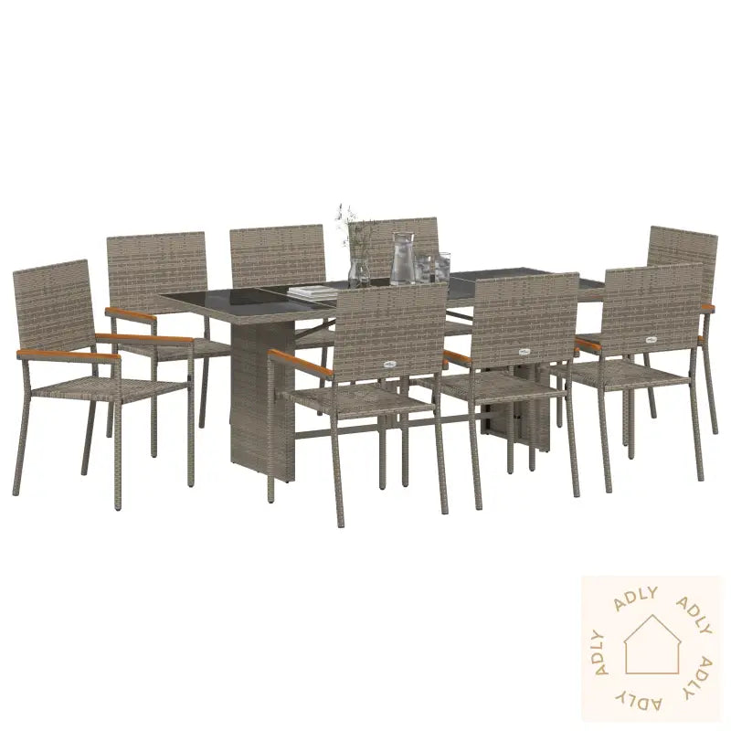 Denne 9-delte hage spisegruppen er et fleksibelt valg av hagemøbler, perfekt for ethvert utendørsområde som terrasse, balkong eller hage. Den stilrene grå polyrottingen gir et moderne uttrykk, mens bordet med herdet glassplate tilfører både praktisk funksjon og en elegant atmosfære. Perfekt for sosiale sammenkomster, grillkvelder eller uformelle måltider ute i det fri.