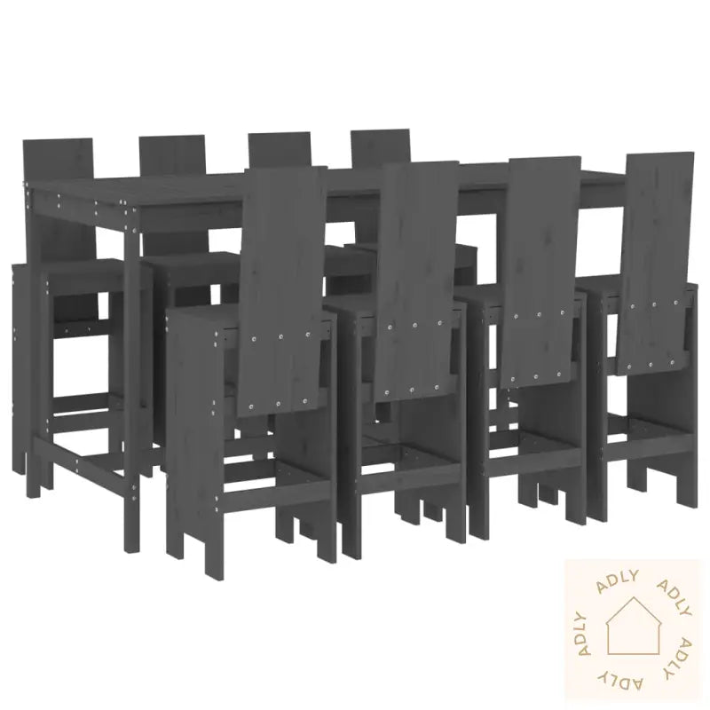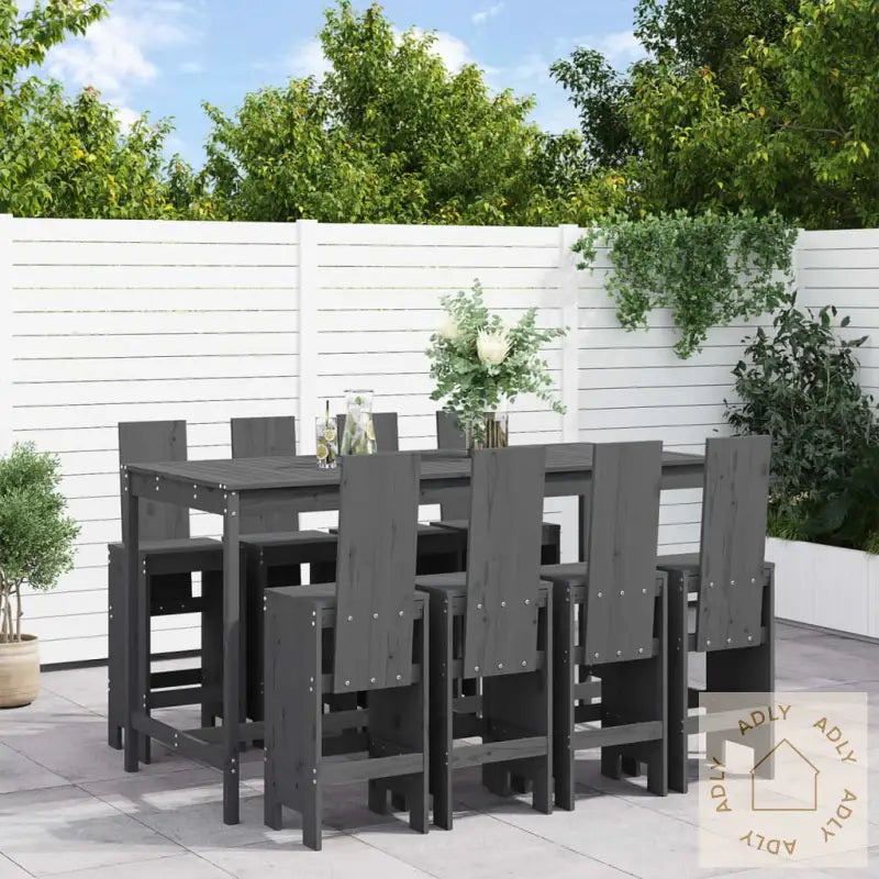 For å bevare møblenes naturlige skjønnhet anbefales det å bruke et vanntett trekk når de ikke er i bruk, slik at dine hagemøbler forblir fine år etter år.Farge: gråMateriale: heltre furuMål barbord: 203,5 x 90 x 110 cm (L x B x H)Mål barkrakk (hver): 40 x 42 x 120 cm (L x B x H)Maksimal lastekapasitet (per sete): 110 kgMontering kreves: jaLeveransen inneholder:1 x hagebord8 x barkrakker