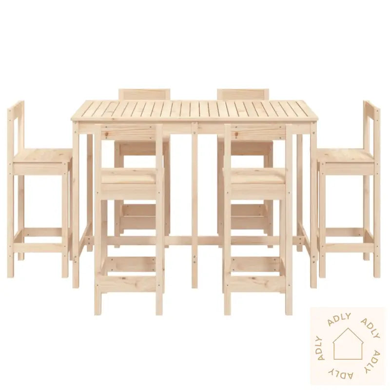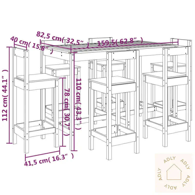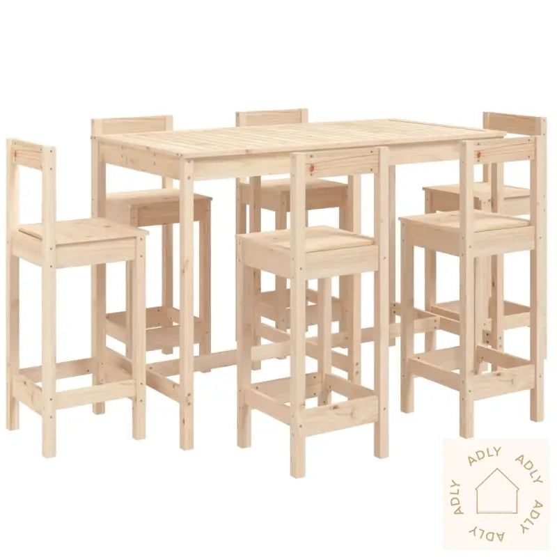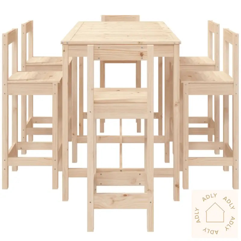 Materiale: heltre furu (ubehandlet)Mål barbord: 159,5 x 82,5 x 110 cm (B x D x H)Mål barstol (hver): 40 x 41,5 x 112 cm (L x B x H)Maksimal lastekapasitet (per sete): 110 kgMontering kreves: jaLeveransen inneholder:1 x barbord6 x barkrakker