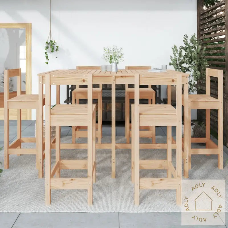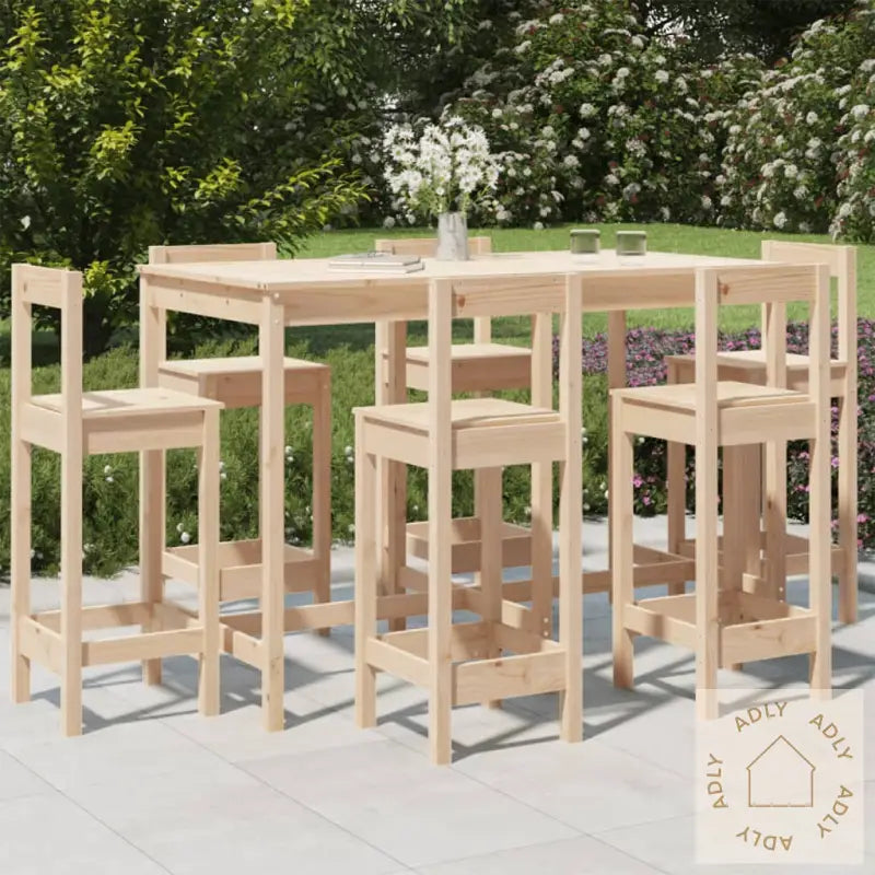 Heltre furu: Dette settet består av heltre furu, et solid og holdbart naturmateriale som passer perfekt til hagemøbler og utendørsmøbler. Den rette årringen sammen med synlige knuter gir bord og stoler et rustikt og autentisk uttrykk, samtidig som det fremhever treets naturlige skjønnhet.Solid topp: Barbordet har en romslig og stabil bordplate, noe som gir deg rikelig plass til servering av både drikkevarer, matretter og dekorative detaljer. Perfekt for sosiale sammenkomster eller avslappende stunder ute.Komfortable seter: Barstolene av heltre furu er utformet med rygglene og innebygget fotstøtte for ekstra komfort - ideelle for lange, hyggelige kvelder. Setehøyden gjør at du får en behagelig sittestilling enten du nyter frokost, lunsj eller noe godt i glasset.Brede bruksområder: Med sitt enkle og minimalistiske design glir dette terrassebarsettet lett inn i de fleste omgivelser. Uansett om du bruker det på terrassen, balkongen, hagen eller bakgården, passer det utmerket som funksjonelle og stilige møbler til hjemmet.Merk: