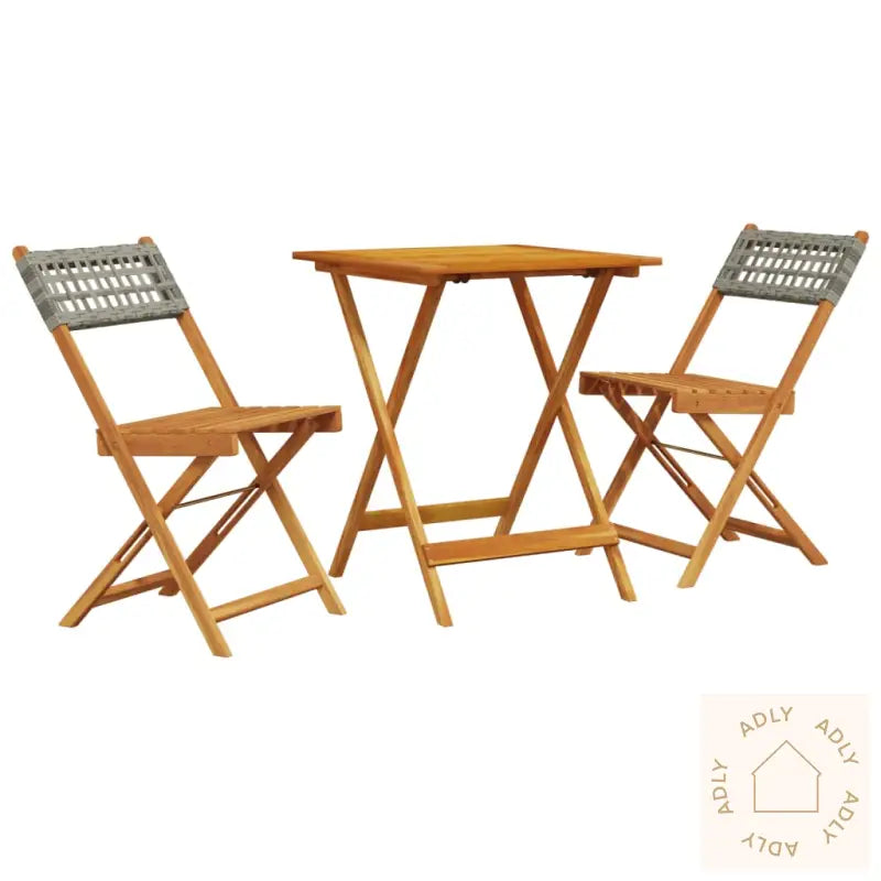 For å få lengst mulig glede av dine hagemøbler anbefales det å bruke et vanntett trekk for beskyttelse mot regn og uvær.Bord:Materiale: oljebehandlet heltre akasieMål: 60 x 60 x 75 cm (L x B x H)SammenleggbarHagestol:Farge: gråMaterialer: heltre akasie med oljefinish, PE-rottingSamlet mål: 41 x 52,5 x 102,5 cm (B x D x H)Mål sete: 38 x 35 cm (B x D)Høyde sete fra bakken: 44 cmMaksimal lastekapasitet (per sete): 110 kgPute inkludert: neiMontering kreves: jaLeveransen inneholder:1 x hagebord2 x hagestoler