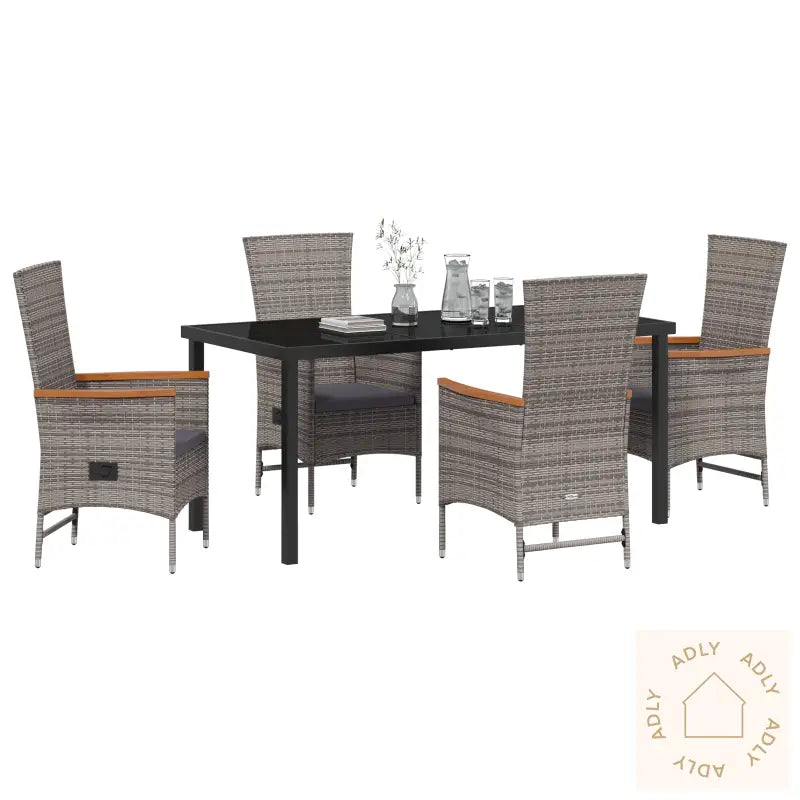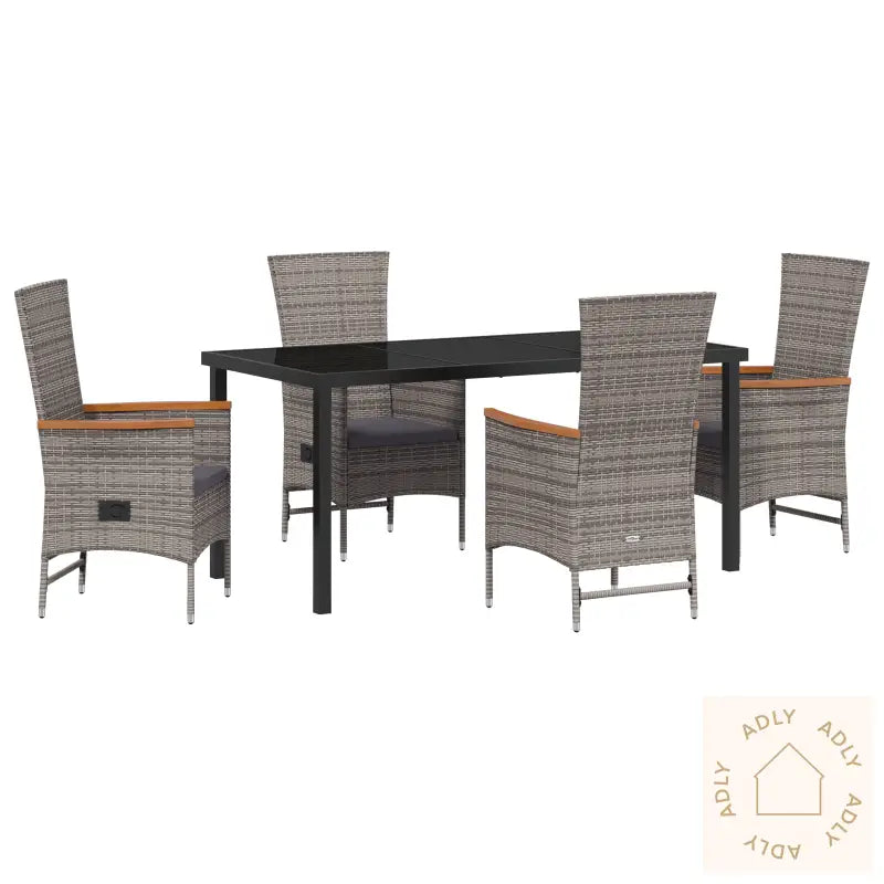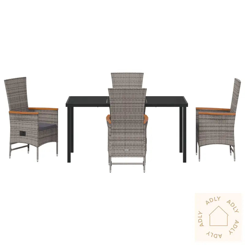 Antall elementer: 5Farge: GråForm: RektangulærMateriale: Syntetisk poly-rotinngFinish: PulverlakkertInnendørs/Ute: Innendørs / UtendørsTrekk inkludert: NeiRom: Garten und TerrassegBatterier inkludert: NeiHodegavl inkludert: NeiMaksimalt antall personer: 4Min-Max mål: 91.00 - 108.00Overflatehøyde: 5.00 cmBenhøyde: 43.00 cmSetedybde: 47.00 cmSittekapasitet: 4Vugger: NeiStige: NeiMerke: Leveransen inneholder: 1 x Bord, 4 x StolerMontering nødvendig: JaAnbefalt antall personer for montering: 2