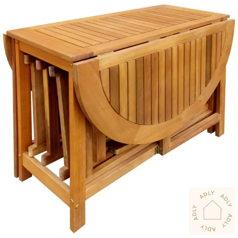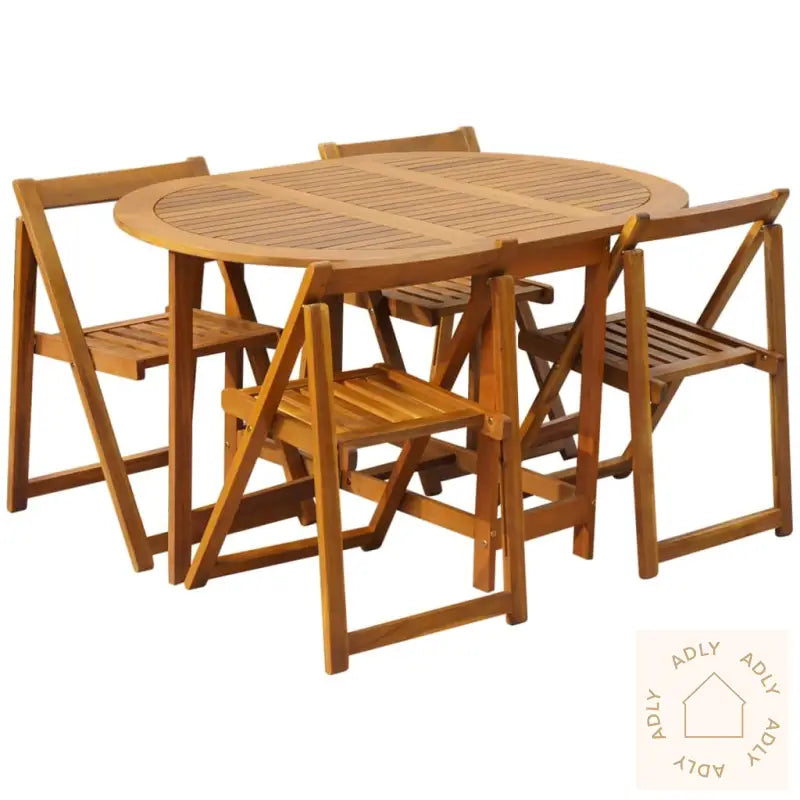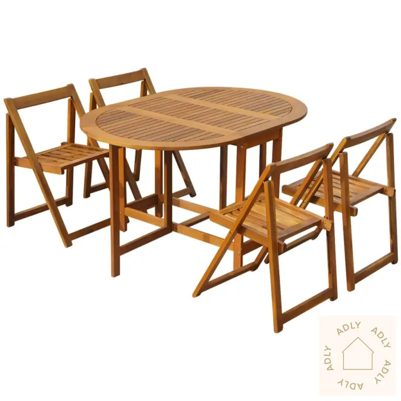 Leveringen inkluderer både klaffebord og fire sammenleggbare stoler, så du har komplette møbler til hjemmet ditt utendørs, klare til bruk.