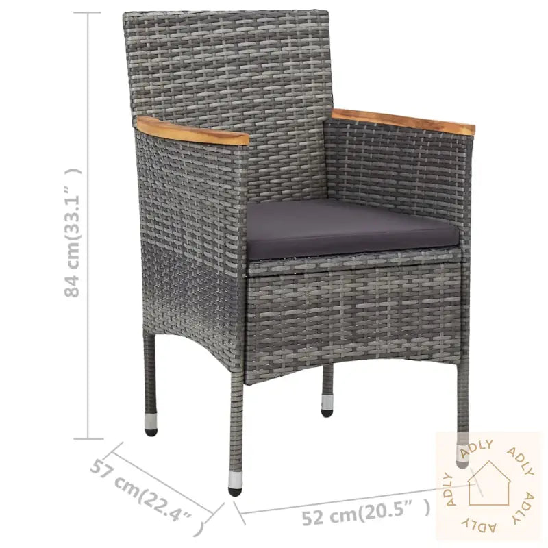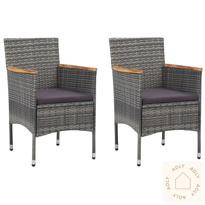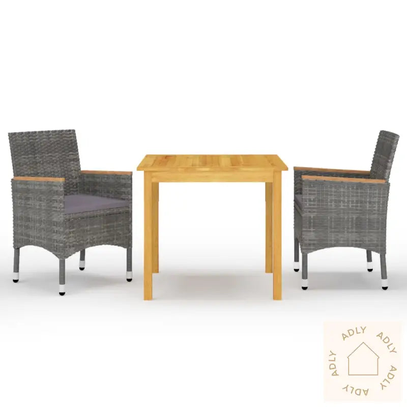 Bord:Materiale: oljebehandlet heltre akasieMål: 85 x 85 x 74 cm (L x B x H)Stol:Farge: gråFarge pute: mørkegråMaterialer: PE (polyetylen) rotting, pulverlakkert stål, heltre akasie med naturlig oljefinishMål stol: 52 x 57 x 84 cm (B x D x H)Mål sete: 39/44,5 x 46 cm (B x D)Høyde armlene: 62/65 cmMål ryggstøtte: 38/45 x 53 cm (B x H)Tykkelse setepute: 4 cmMontering kreves: jaLeveransen inneholder:1 x bord2 x stoler2 x puter