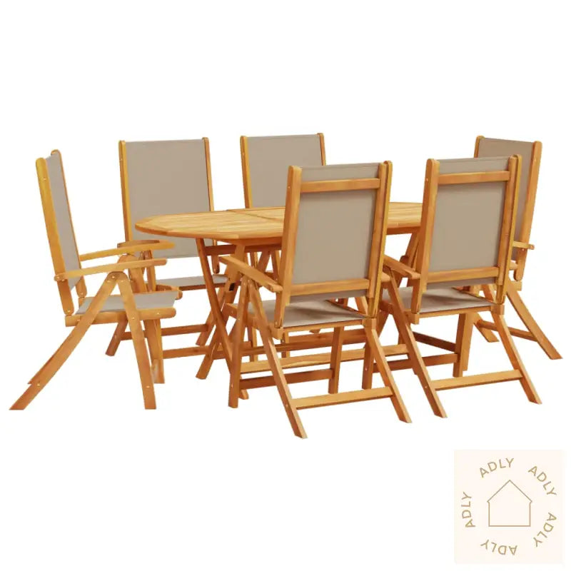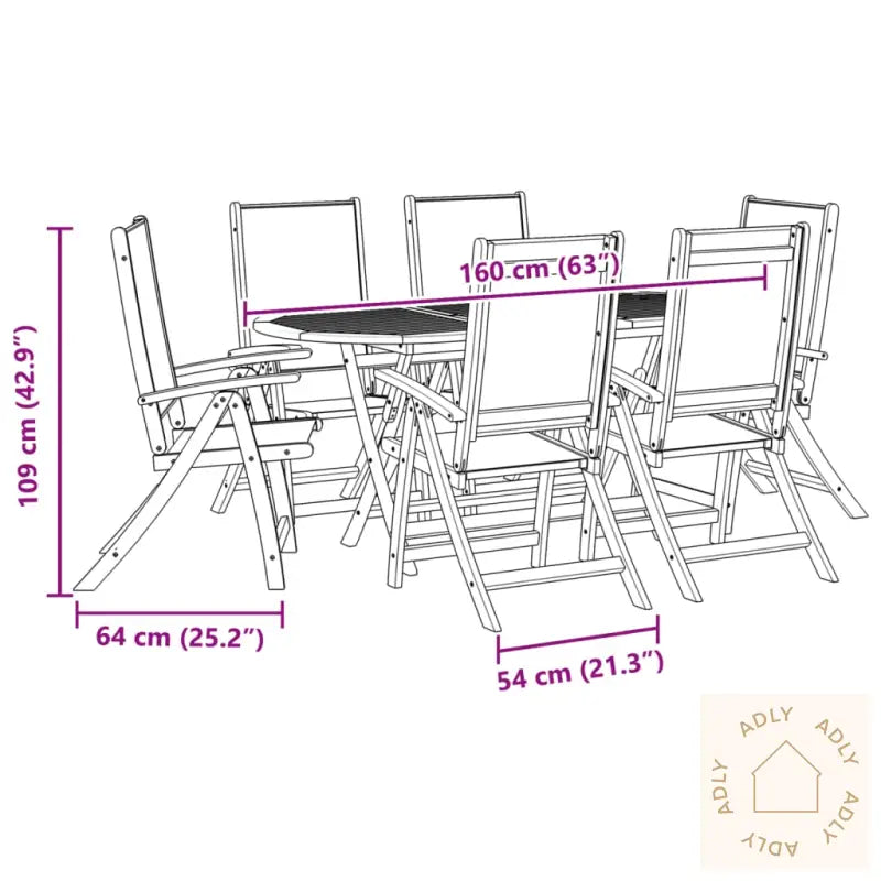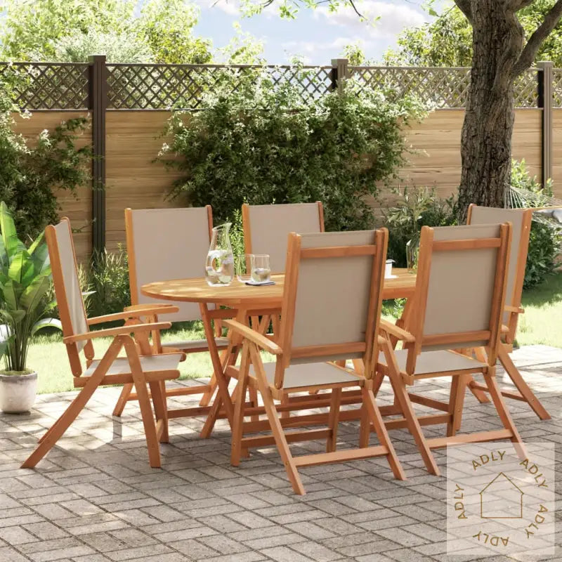 For å bevare utseendet og forlenge levetiden anbefales det å bruke et vanntett trekk over dine hagemøbler når de ikke er i bruk.Hagebord:Materiale: oljebehandlet heltre akasieMål: 160 x 85 x 75 cm (L x B x H)Sammenleggbart designHagestol:Farge: gråbrunMaterialer: heltre akasie med oljebehandling, textileneMål: 57 x 72 x 109 cm (B x D x H)Høyde sete fra bakken: 45 cmHøyde armlene fra bakken: 66 cmTilbakelent ryggstøtte (i 5 posisjoner)Maksimal lastekapasitet (per sete): 110 kgMontering kreves: jaLeveransen inneholder:1 x hagebord6 x hagestoler