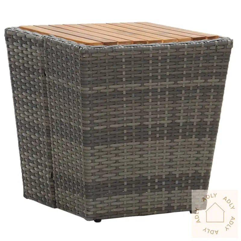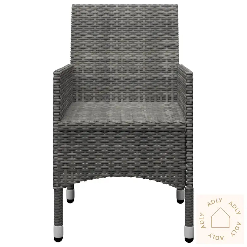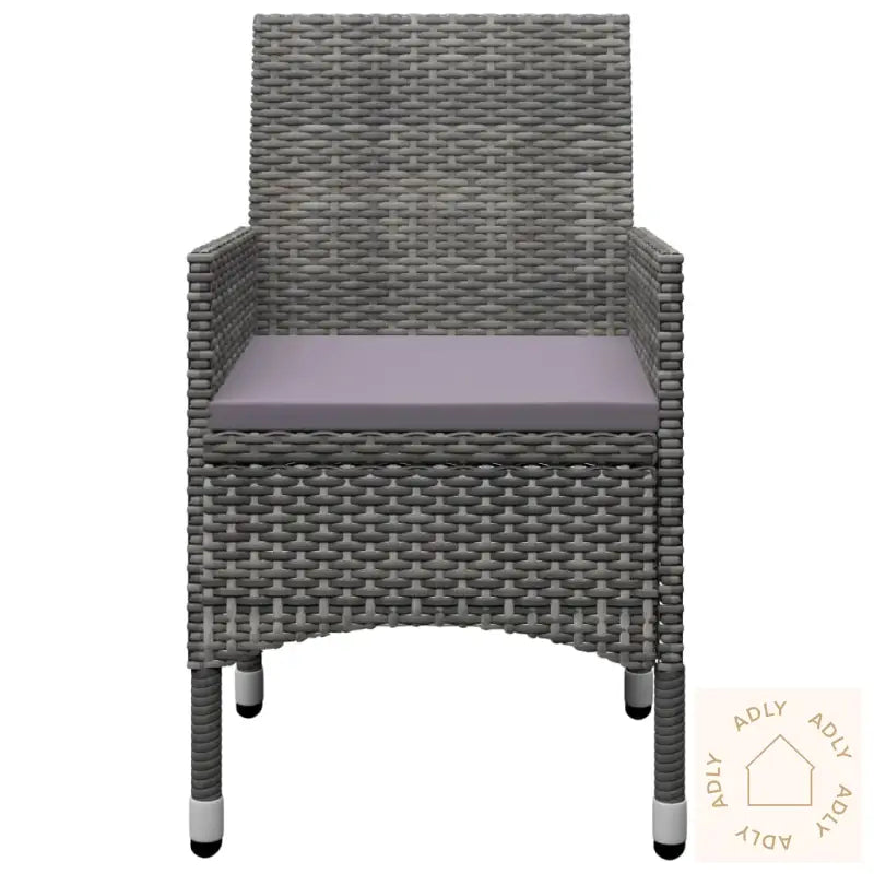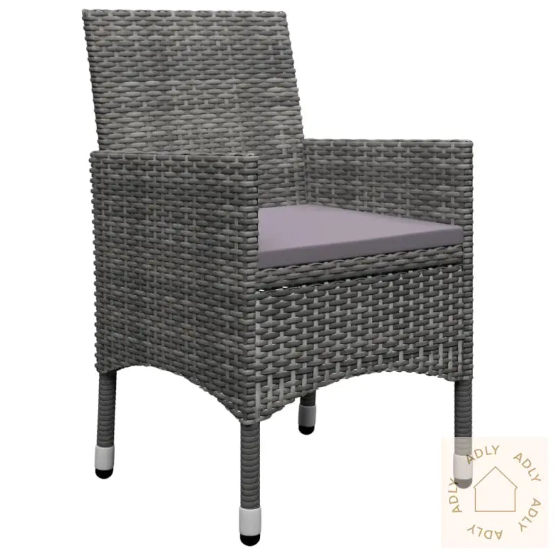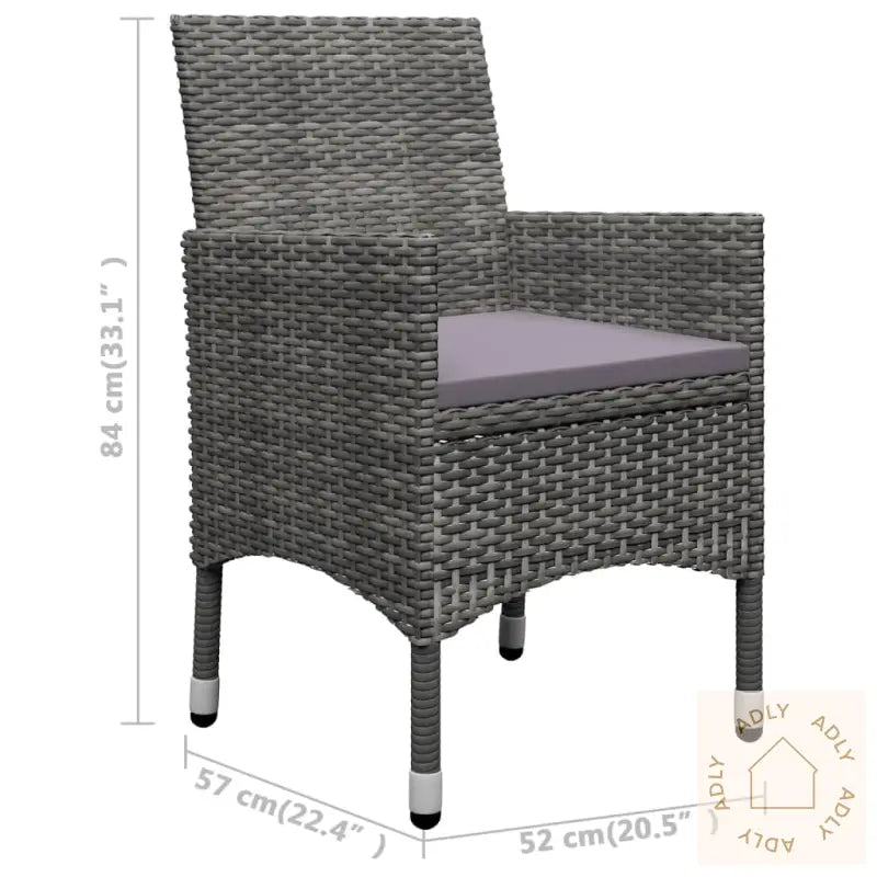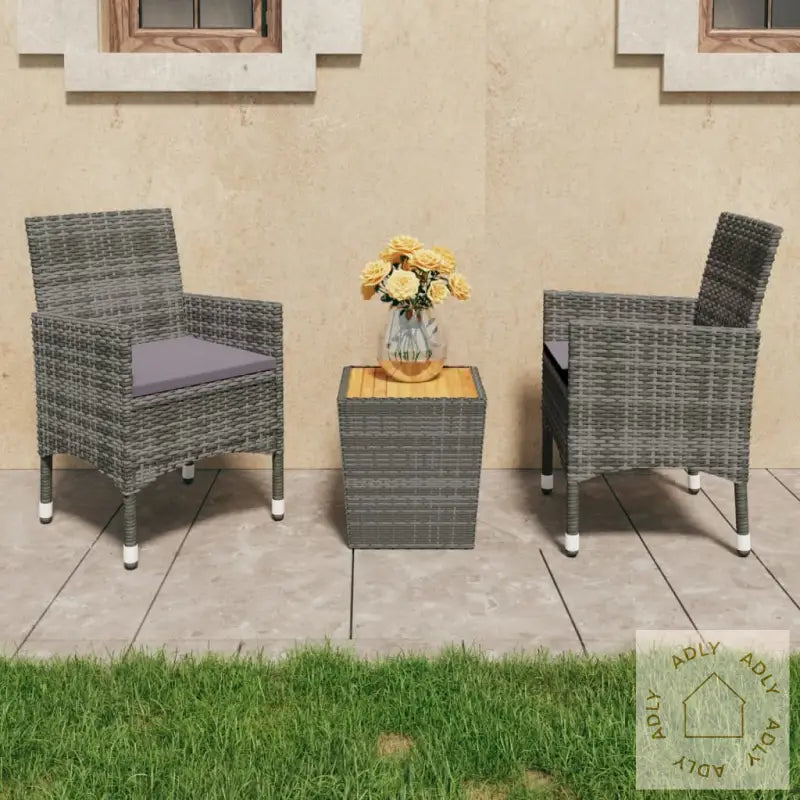 Farge: gråFarge pute: mørkegråMaterialer: polyrotting, stål, stoff (100 % polyester), heltre akasie med oljefinishMål bord: 41,5 x 41,5 x 43 cm (L x B x H)Mål stol: 52 x 57 x 84 cm (B x D x H)Høyde sete fra bakken: 42 cmMål sete: 39/44,5 x 46 cm (B x D)Høyde fra bakken armlene: 62/65 cmTykkelse setepute: 4 cmMontering kreves: jaLeveransen inneholder:1 x bord2 x stoler2 x seteputer