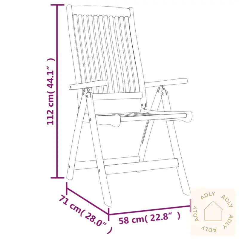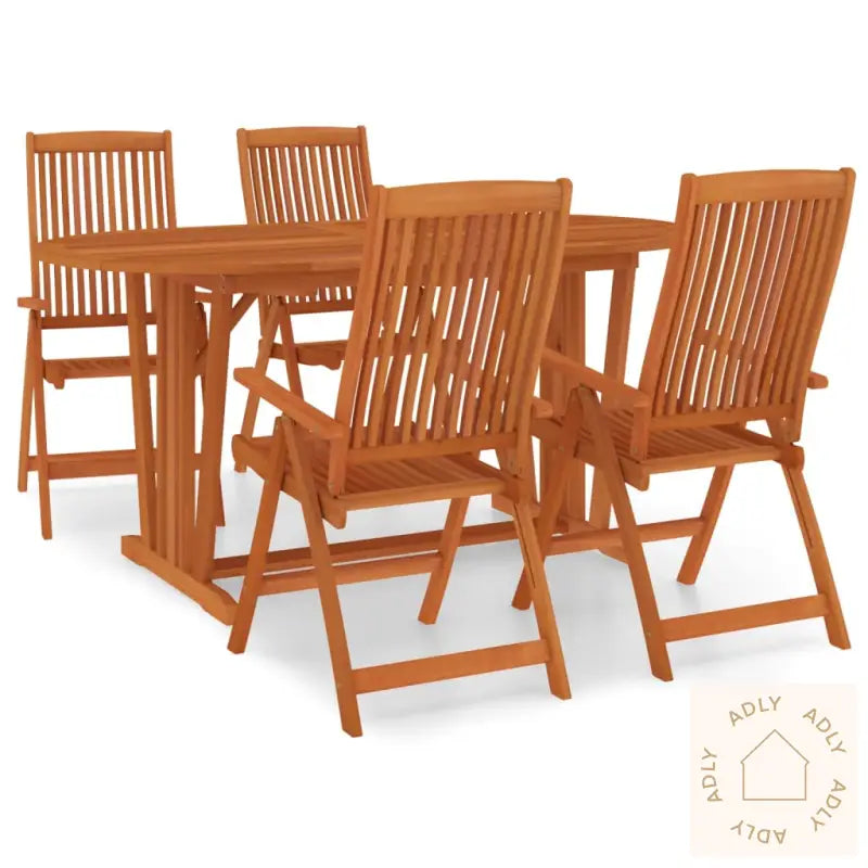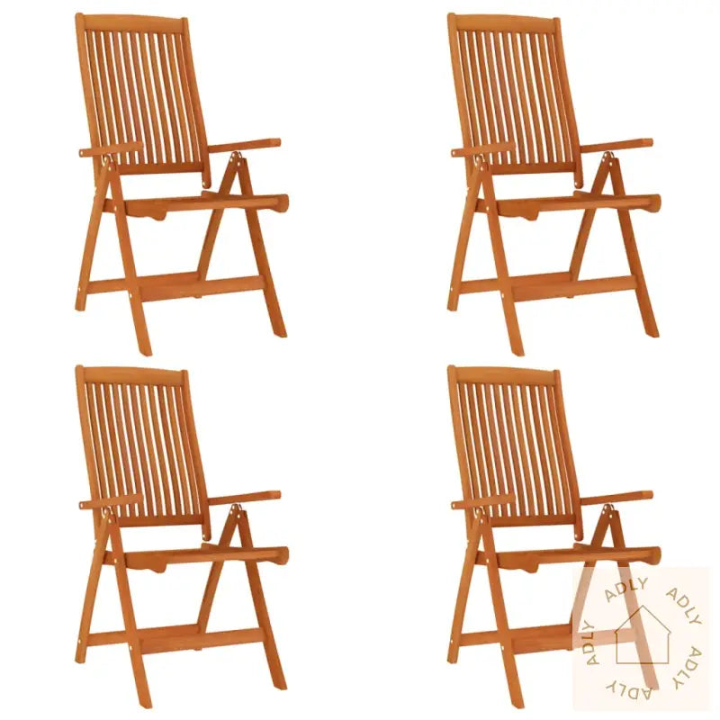 Stol:Materialer: Heltre eukalyptus med oljebehandlingMål stol: 58 x 71 x 112 cm (B x D x H)Justerbar rygg, 5 posisjonerSammenleggbar for enkel lagringMaksimal lastekapasitet (per sete): 110 kgMontering krevesLeveransen inneholder:1 x bord4 x stoler