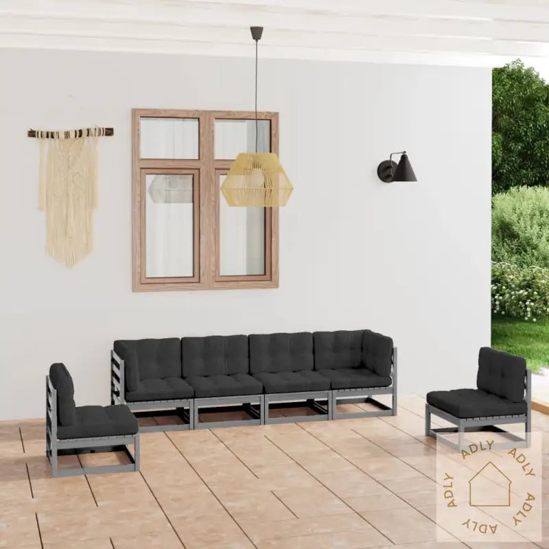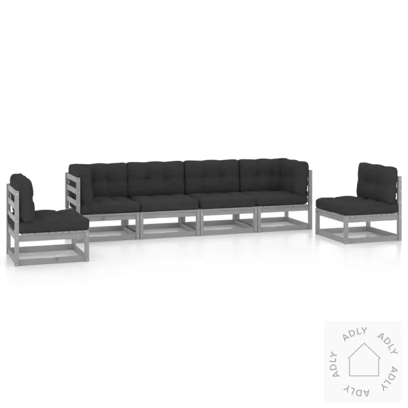 Farge: gråFarge pute: antrasittMaterialer: heltre furu, stoff (100% polyester)Mål hjørne-/midtsofa: 70 x 70 x 67 cm (B x D x H)Mål setepute: 70 x 70 x 8 cm (L x B x T)Mål rygg-/sidepute: 70 x 40 x 8 cm (L x B x T)Montering kreves: jaLeveransen inneholder:2 x hjørnesofaer4 x midtsofaer6 x seteputer8 x rygg-/sideputer