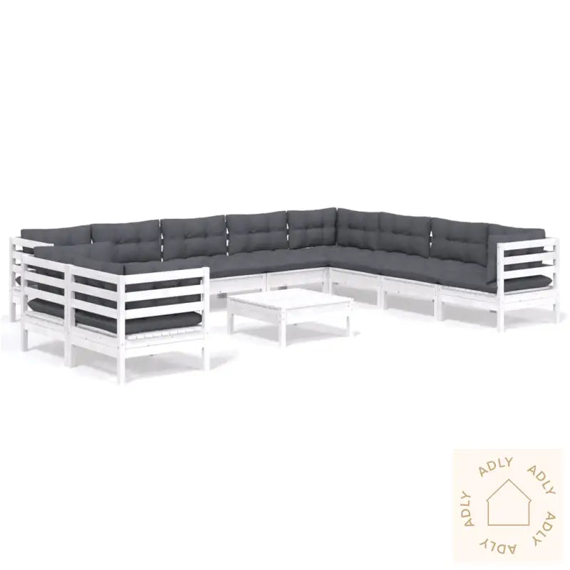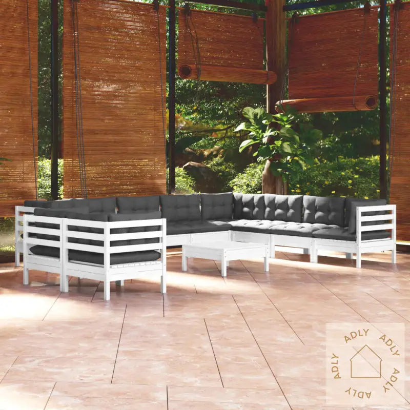 Farge: hvitFarge pute: antrasittMaterialer: heltre furu, stoff (100% polyester)Mål: 63,5 x 63,5 x 62,5 cm (B x D x H)Mål: 63,5 x 63,5 x 62,5 cm (B x D x H)Mål bord/fotskammel: 63,5 x 63,5 x 28,5 cm (B x D x H)Mål setepute: 60 x 60 x 5 cm (L x B x T)Mål ryggpute: 60 x 32 x 5 cm (L x B x T)Maksimal lastekapasitet (per sete): 110 kgMontering kreves: jaLeveransen inneholder:5 x hjørnesofaer5 x midtsofaer2 x fotskamler/bord11 x seteputer15 x ryggputer