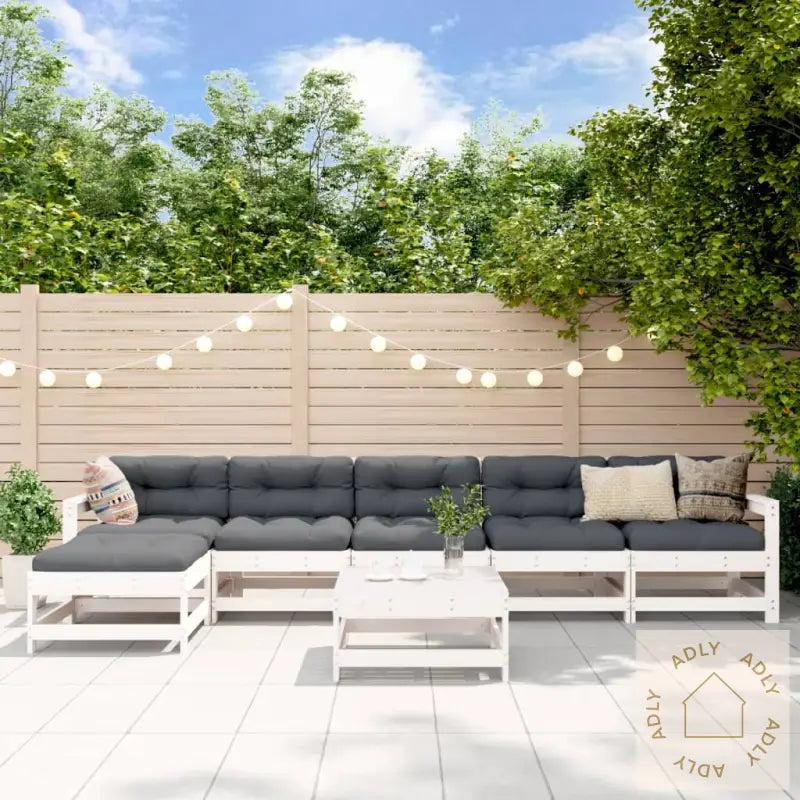 For å ta vare på hagemøblene og forlenge levetiden anbefaler vi å bruke vanntett trekk når møblene ikke er i bruk, særlig i regn og snø.Putene følger ikke med, så du kan selv velge tekstiler og farger som matcher stilen din.Farge: HvitMateriale: Heltre furuMateriale lameller: KryssfinerMål midtsofa: 62 x 62 x 70,5 cm (L x B x H)Mål fotskammel/salongbord: 62 x 62 x 32 cm (L x B x H)Mål hjørnesofa: 66 x 62 x 70,5 cm (L x B x H)Maksimal lastekapasitet (per sete): 110 kgMontering kreves: jaLeveransen inneholder:3 x midtsofaer2 x hagefotskammel/sofabord2 x hjørnesofaerDette allsidige settet i heltre furu gir deg massevis av muligheter enten du skal ha hagemøbler, praktiske løsninger til uteplassen eller bare ønsker møbler til hjemmet som tåler norske forhold. Gjør uteområdet personlig og koselig!