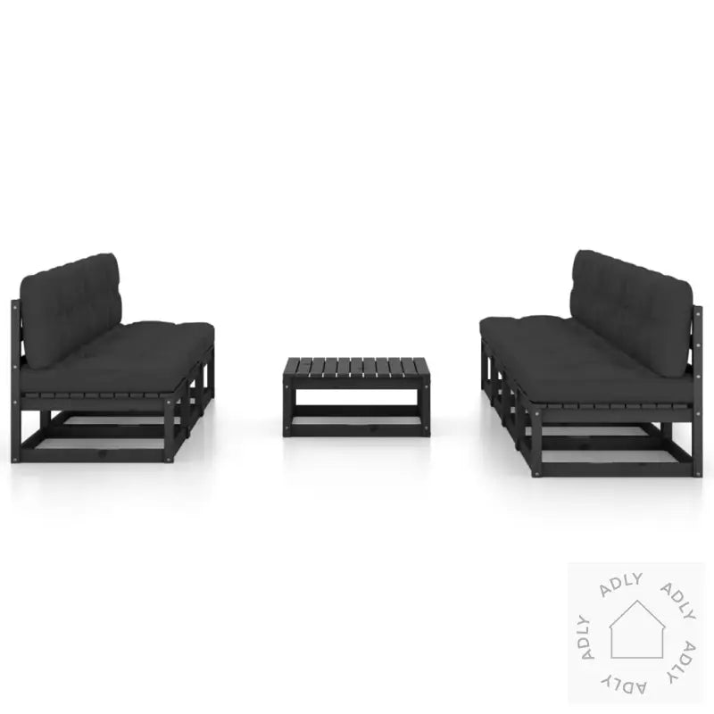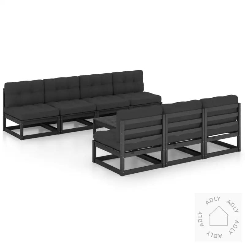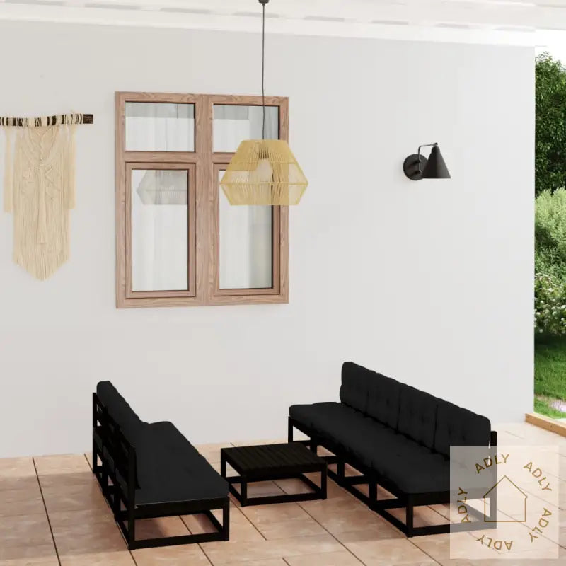 Farge: svartFarge pute: antrasittMaterialer: heltre furu, stoff (100% polyester)Mål midtsofa: 70 x 70 x 67 cm (B x D x H)Mål bord: 70 x 70 x 30 cm (B x D x H)Mål setepute: 70 x 70 x 8 cm (L x B x T)Mål ryggpute: 70 x 40 x 8 cm (L x B x T)Maksimal lastekapasitet (per sete): 110 kgMontering kreves: jaLeveransen inneholder:7 x midtsofaer1 x bord7 x seteputer7 x ryggputer