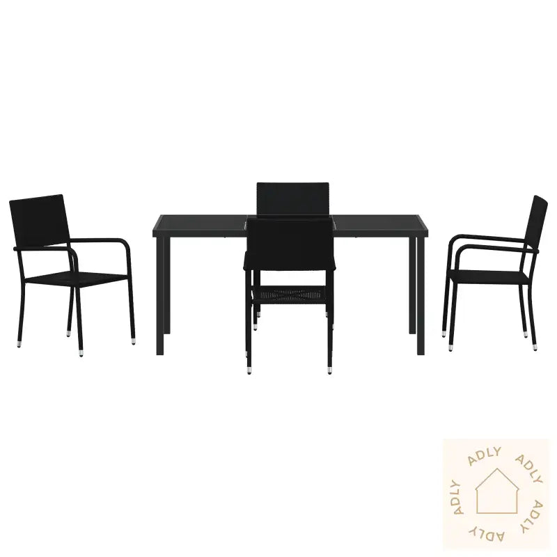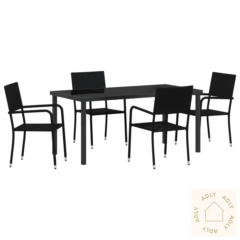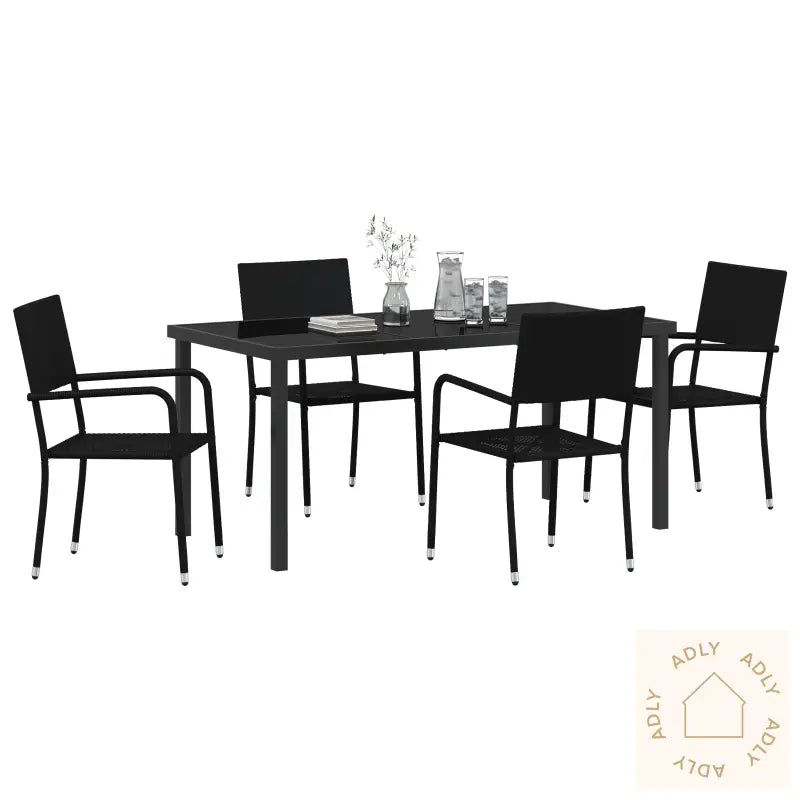 Antall produkter: 5 (4 stoler, 1 bord)Farge: SvartForm: RektangulærMateriale: Syntetisk poly rottingOverflate: MattInnendørs/Ute: Kun utendørsTrekk inkludert: NeiRom: Hage og terrasseBatterier inkludert: NeiHodegjerde inkludert: NeiKapasitet pr. stol: 110 kgMaks antall personer: 4Maksimal vekt: 110 kg per stolBeinhøyde: 42 cmSittedybde: 60 cmSittekapasitet: 1Svinger: NeiStige: NeiMerke: Leveringen inneholder: 4 x stoler, 1 x bordMontering kreves: JaAnbefalt antall personer for montering: 2