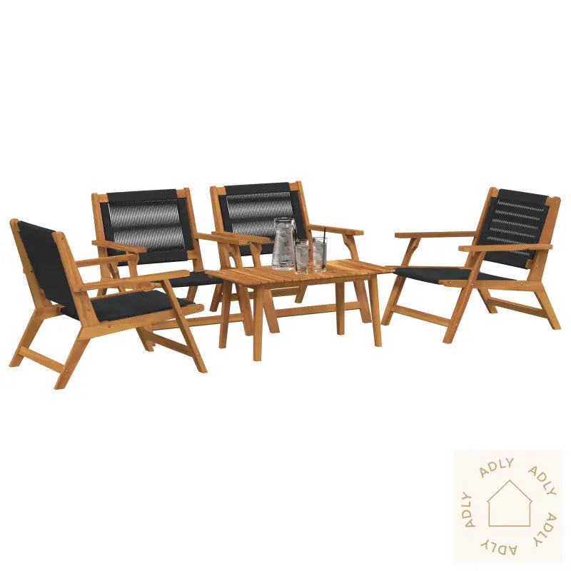 Dette stilige hagemøbelsettet har fire komfortable stoler og et rektangulært kaffebord, perfekt for å gjøre terrassen eller uteområdet til et stilfullt samlingssted. Det solide akasietreet sammen med slankt svart syntetisk tau gir en koselig og moderne atmosfære, noe som gjør det ideelt for kvalitetstid med venner og familie gjennom hele sesongen.