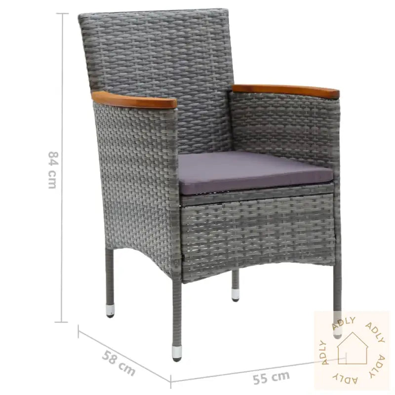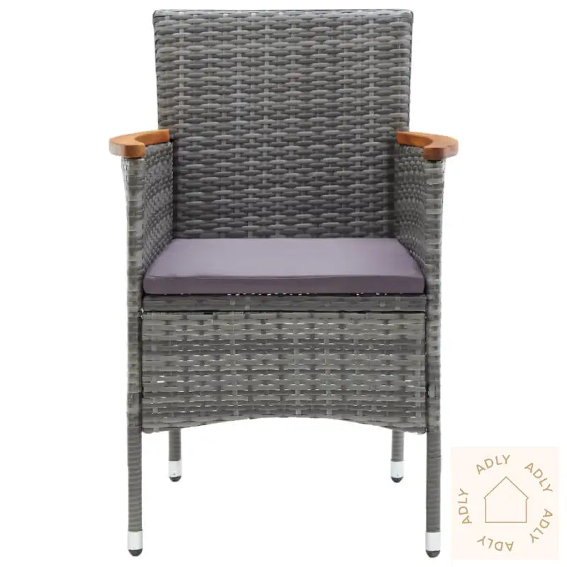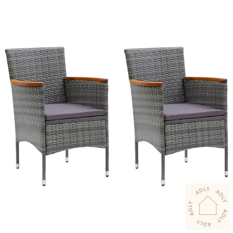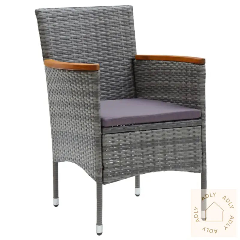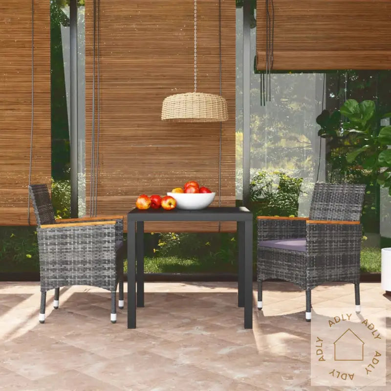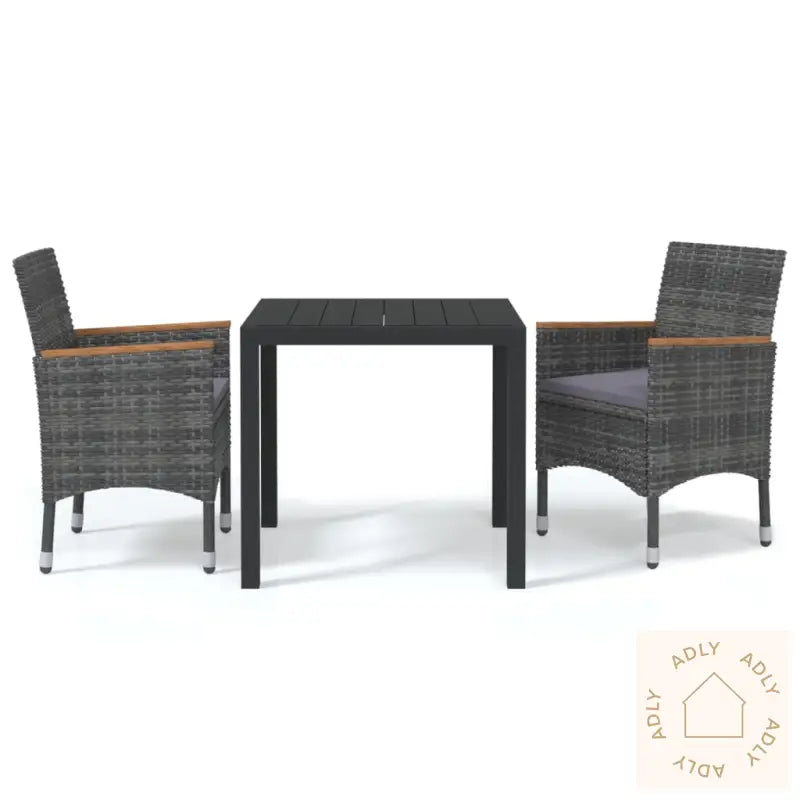 BordFarge: svartMaterialer: WPC, aluminiumMål: 80 x 80 x 74 cm (L x B x H)StolFarge PE-rotting: gråFarge pute: mørkegråMaterialer: PE-rotting, stål, stoff (100 % polyester), heltre akasie med naturlig oljefinishMål: 55 x 58 x 84 cm (B x D x H)Mål sete: 39/44,5 x 46 cm (B x D)Høyde sete fra bakken: 42 cmHøyde fra bakken armlene: 62/65 cmTykkelse setepute: 4 cmMontering kreves: jaLeveransen inneholder:1 x bord2 x stoler2 x seteputer