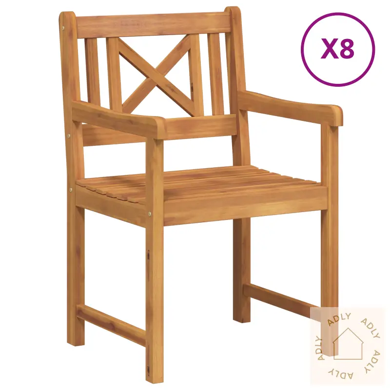 Dette settet med åtte hagemøbler kombinerer moderne stil og varig funksjonalitet, ideelt for deg som vil ha slitesterke møbler til hjemmet og uterommet. Laget av massivt akasietre, er hver stol nøye behandlet med en oljet finish som ikke bare gir et elegant utseende, men også gjør dem robuste mot vær og vind. Disse stolene passer like fint på terrasse, balkong eller i hagen – hvor du enn vil skape en innbydende uteplass som varer år etter år.