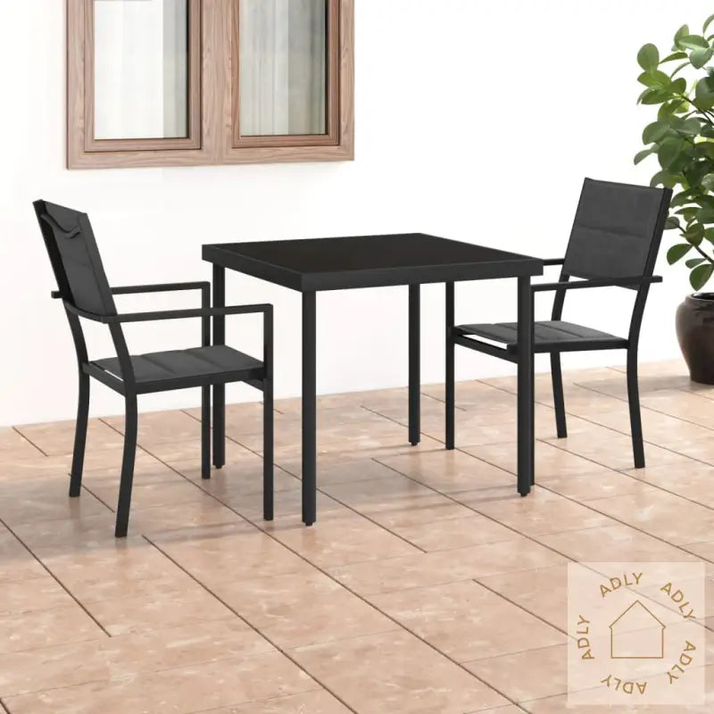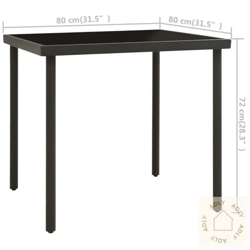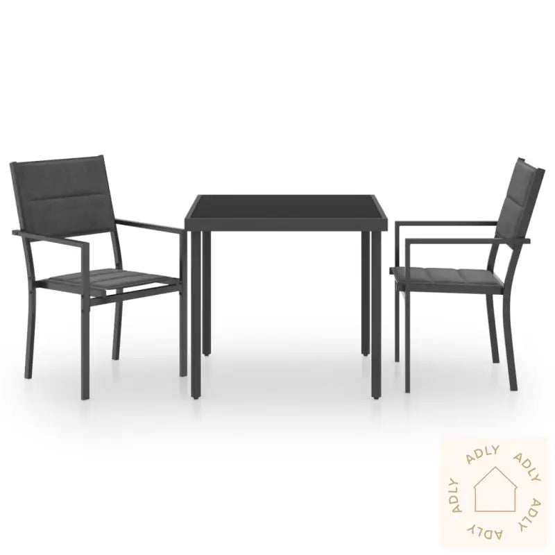 Bord:Farger: svart og antrasittMateriale bord: herdet glass, pulverlakkert stålMål bord: 80 x 80 x 72 cm (L x B x H)Stol:Farger: grå og antrasittMaterialer: textilene, pulverlakkert stålMateriale fyll: bomullMål: 54 x 63 x 90 cm (L x B x H)Bredde sete: 40 cmDybde sete: 56 cmHøyde sete fra bakken: 42,5 cmHøyde armlene fra bakken: 62 cmMontering kreves: jaLeveransen inneholder:1 x bord2 x stoler