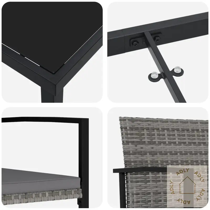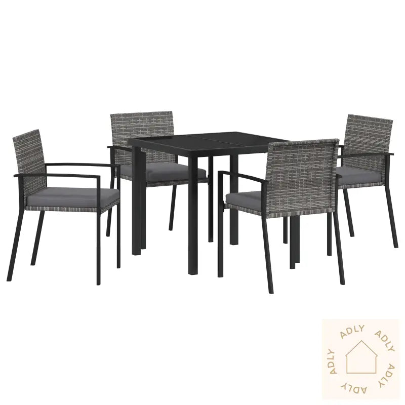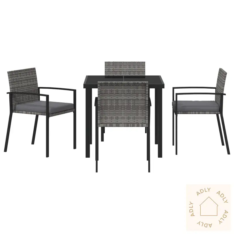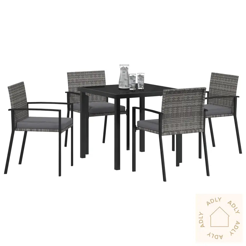 Moderne utseende gjør at møblene glir rett inn i ulike typer utemiljøer, uansett om stilen er enkel eller mer sofistikert.Den solide stålrammen gir stabilitet og sikrer at du kan bruke hagemøblene over lang tid uten bekymringer.Tykke, komfortable puter sørger for myk sittekomfort, slik at du virkelig kan lene deg tilbake og nyte sommerdagene.Møblene er lette nok til at de enkelt kan flyttes dit du trenger dem, men står stødig på underlaget.UV- og vannbestandig materiale gjør disse møblene til et smart valg for norsk klima der været kan skifte fort.Antall produkter: 5Farge: GråMønster: Rottingsmønster for autentisk utseendeForm: Rektangulær bordflate gir god plassMateriale: Syntetisk polyrotting for lavt vedlikeholdFinish: Pulverlakkert for ekstra beskyttelse og lang levetidInnendørs/Utendørs: Kun utendørs, ideell for hagen eller terrassenCover inkludert: NeiRom: Passer ute i hagen og på terrasseBatterier inkludert: NeiSeng gavl inkludert: NeiMaks antall personer: 4Maks vekt: 110 kg per stolOverflate høyde: 5,0 cm (pute)Benhøyde: 42,0 cmSetedybde: 45,0 cm for god sitteplassSittekapasitet per stol: 1Gynge: NeiLadder: NeiMerke:Leveransen inkluderer: 4 x spisestol, 1 x bord – alt du trenger for et komplett utendørs spiseområdeMontering nødvendig: Ja, settes enkelt sammen av to personer