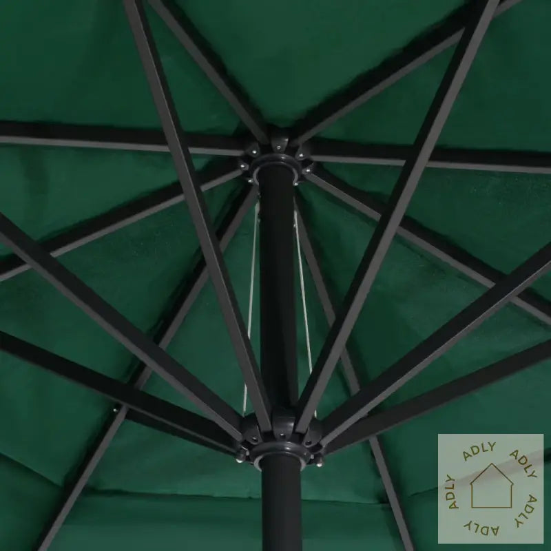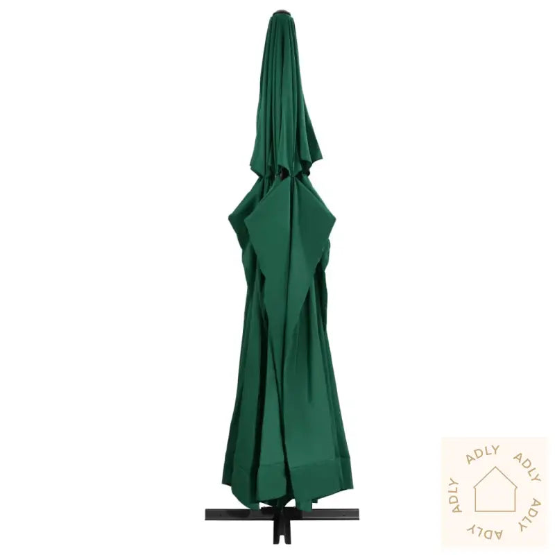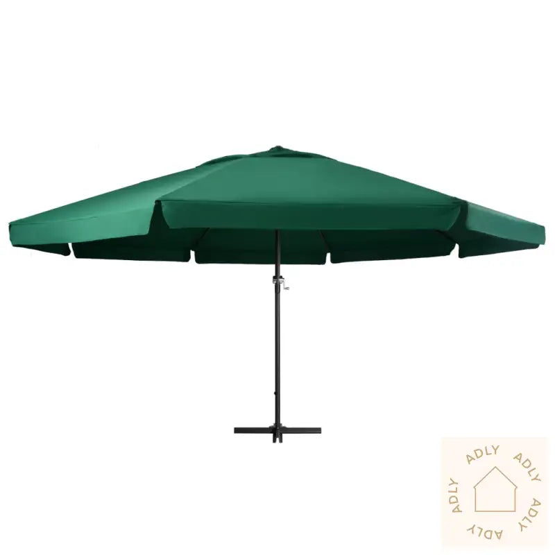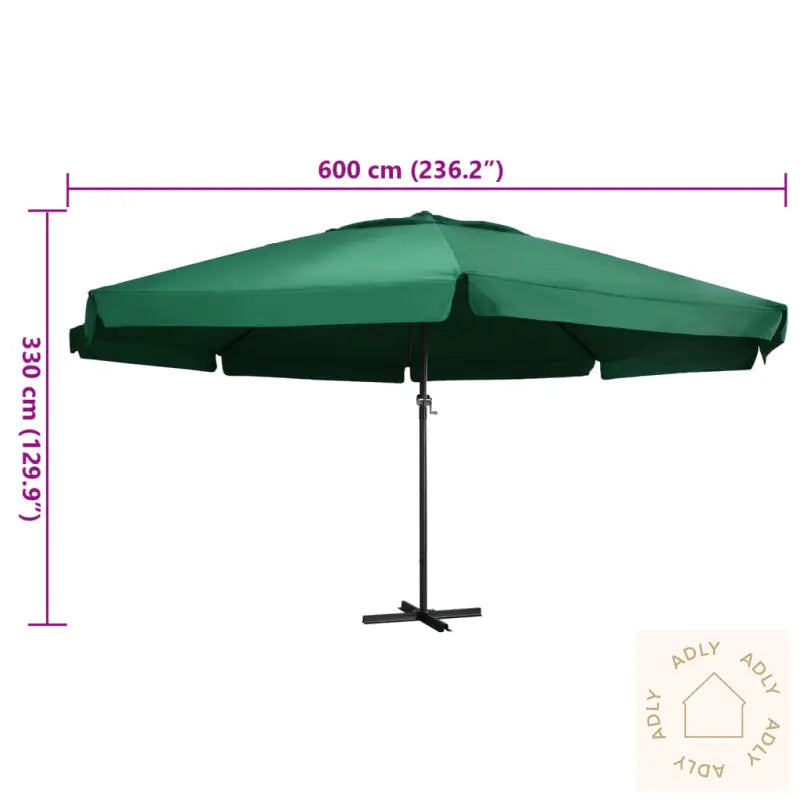 Farge: grønnMaterialer: stoff (100% polyester) med PA-belegg, aluminium, stålSamlet mål: 600 x 330 cm (Diameter x H)Mål kryssfot: 100 x 100 cm (L x B)Diameter stang: 58 mmMed lufteventil og brukervennlig sveivesystem8 solide aluminiumsspiler holder duken på plassMontering kreves: ja