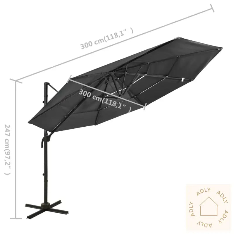 Farge: antrasittMaterialer: polyester, pulverlakkert aluminiumSamlet mål: 300 x 300 x 247 cm (B x D x H)Mål kryssfot: 100 x 100 cm (L x B)Inkluderer 8 aluminiumsspiler for økt stabilitet
