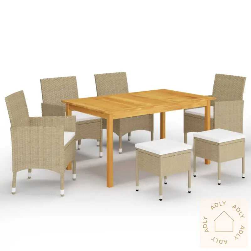 Spisebordet er laget av heltre akasie med oljebehandlet overflate, noe som gir både et naturlig utseende og en solid konstruksjon. Heltre akasie er kjent for sin slitestyrke og gjør bordet ekstra stabilt, robust og enkelt å holde rent – det tåler godt daglig bruk i hagen eller på terrassen. Stolene og krakkene har en kraftig pulverlakkert stålramme dekket med værbestandig PE-rotting slik at du får møbler til hjemmet som beholder formen og utseendet selv etter flere sesonger ute. Materialene er svært lettstelte og krever minimalt vedlikehold.