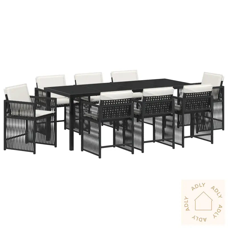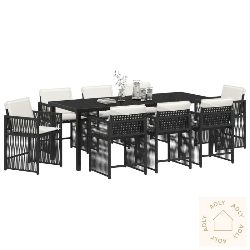 Dette hagesettet er laget av solid PE-rottefilt, som med sitt elegante utseende imiterer naturlig rotting, men er samtidig mer slitesterkt. Syntetisk poly rottefilt krever minimalt med vedlikehold – litt enkel rengjøring holder både bordet og stolene i topp stand sesong etter sesong. Perfekt for deg som ikke vil bruke mye tid på vedlikehold av møbler til hjemmet og uteplassen.Tykke, myke puter sørger for ekstra god komfort gjennom lange, avslappende dager ute, enten du tar en pause alene eller inviterer gjester. Det behagelige stoffet gjør hagesettet ideelt for både måltider og avslapning, og passer like godt til uformelle sammenkomster som til festlige anledninger.Bordet og stolene har et smart design – ryggstøttene kan foldes ned, så du enkelt kan rydde det bort eller spare plass når det trengs. Dette gjør sette ekstra praktisk for deg som har balkong eller mindre uteplass og ønsker fleksibel bruk av plassen.Den solide rammen er laget av pulverlakkert stål, noe som gir pålitelig styrke og god motstand mot vær og vind. Hagemøblene holder seg pene og stabile, uavhengig av om de står ute store deler av året.Her får du en flott kombinasjon av stilren design og praktisk nytteverdi. Gruppen passer perfekt på terrassen, i hagen eller på uteområdet ditt. Nyt allsidig bruk og robuste materialer – en sikker investering for alle som ønsker slitesterke hagemøbler i poly rottefilt til både små og store selskaper.Antall deler: 9Farge: SvartForm: RektangulærMateriale: Syntetisk poly rottefiltFinish: PulverlakkertBruksområde: Både innendørs og utendørsTrekk inkludert: NeiRom: Hagen og terrasseBatterier inkludert: NeiHodegavl inkludert: NeiKapasitet: Ingen spesifikk kapasitet grense oppgitt.Maksimalt antall personer: 8Maksimal vekt per sete: 110 kgOverflate høyde: 2 cmBenshøyde: 43 cmSetedybde: 38 cmSittekapasitet: 8Gynger: NeiStige: NeiMerke: Leveransen inneholder: 8 x hagestol, 1 x hagebordMontering nødvendig: JaAnbefalt antall personer for montering: 2