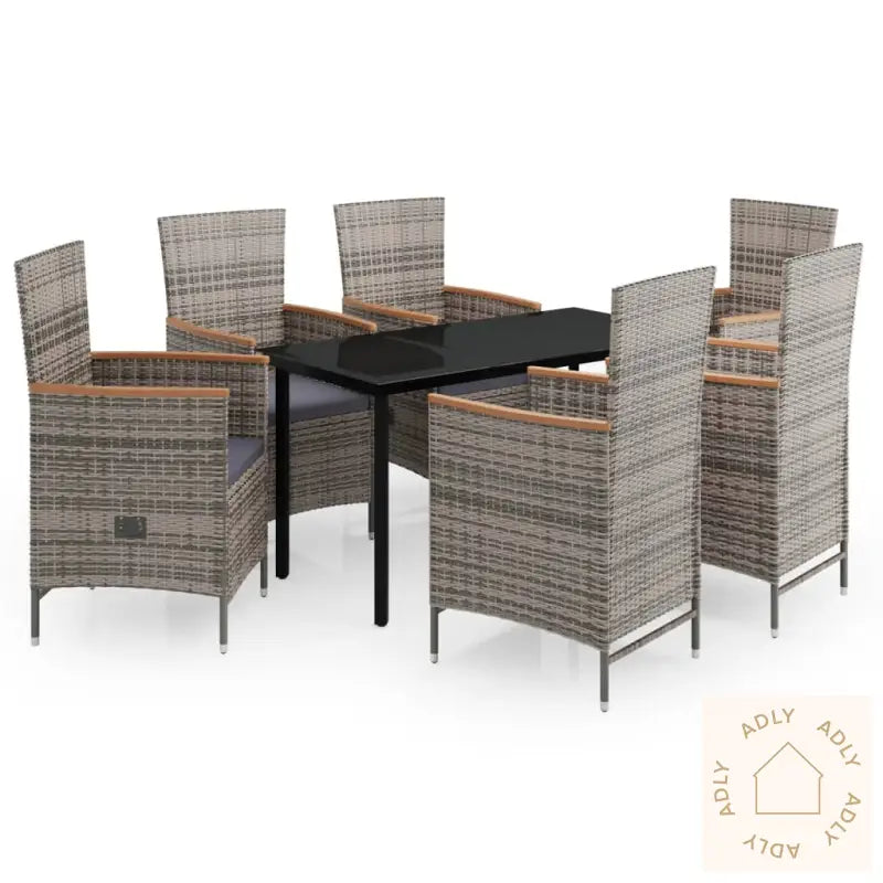 Farger: grå og svartFarge pute: mørkegråMaterialer: PE-rotting, heltre akasie, pulverlakkert stål, glassMateriale putetrekk: 100 % polyesterMål bord: 140 x 70 x 74 cm (L x B x H)Mål stol (ikke tilbakelent): 58 x 62 x 108 cm (B x D x H)Mål stol (tilbakelent): 58 x 90 x 91 cm (B x D x H)Tykkelse pute: 5 cmBredde sete: 47 cmDybde sete: 47 cmHøyde sete fra bakken uten pute: 43 cmHøyde armlene fra bakken: 67 cmMontering kreves: jaLeveransen inneholder:1 x bord6 x stoler6 x seteputer