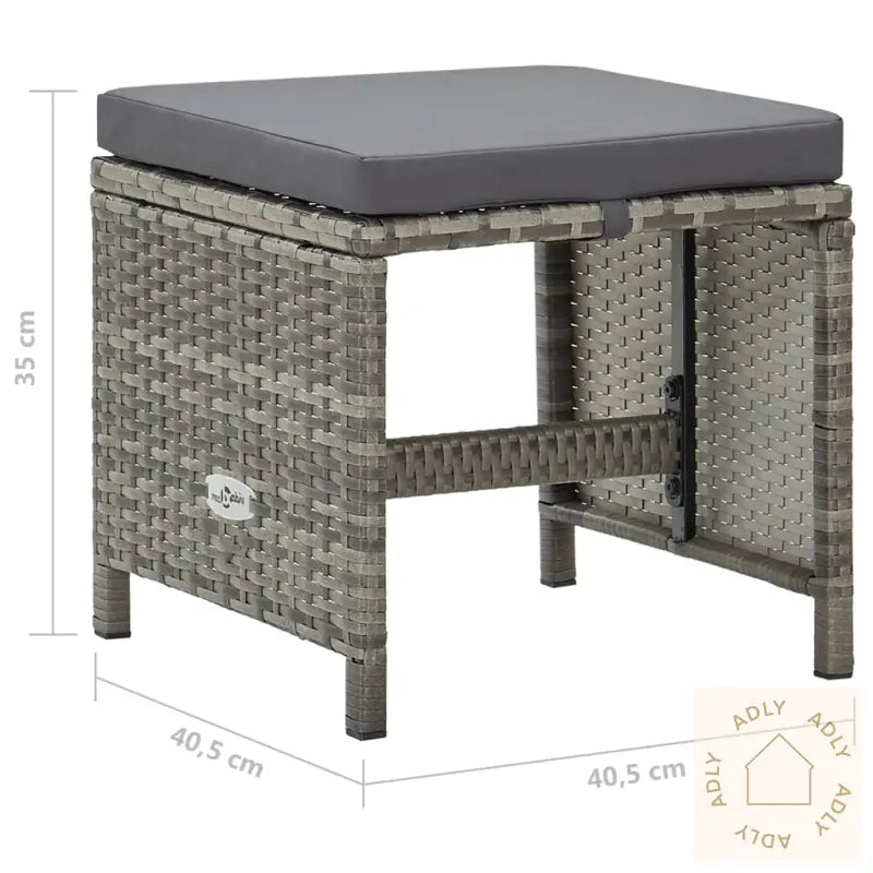 Farge PE-rotting: gråFarge pute: mørkegråMaterialer: PE-rotting, pulverlakkert stål, stoff (100% polyester)Mål: 40,5 x 40,5 x 35 cm (B x D x H)Tykkelse setepute: 5 cmMontering kreves: jaLeveransen inneholder:4 x krakker4 x seteputer