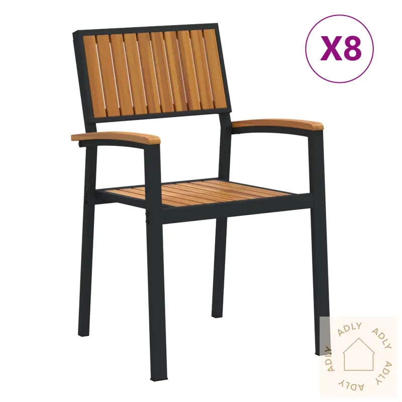 Holdbarhet: Disse stolene er laget av førsteklasses materialer, som solid stål og tre, og tåler variert vær gjennom alle årstider. Den malte overflaten beskytter mot falming fra sol og UV-stråler, noe som sørger for at dine hagemøbler holder seg flotte over tid.Stilig design: Det minimalistiske designet med glatte overflater og rene linjer gir et eksklusivt preg, slik at du får elegante møbler til hjemmet utendørs—perfekt for både rolige middager på terrassen og større sammenkomster i hagen.Komfort: Både armlener og sete er designet med tanke på god ergonomi, slik at du og gjestene dine kan nyte lange måltider komfortabelt. Gjestene dine vil raskt sette pris på den avslappende sitteopplevelsen.Plassbesparende: Stolene er lette å stable bort når de ikke brukes, så de tar minimalt med plass og kan enkelt ryddes unna ved dårlig vær. Praktisk og smidig, spesielt på mindre uteplasser.Anbefalt bruk: Ideelle møbler både til hagen, terrassen, uteplassen eller balkongen. Passer like godt til uformelle lunsjer som til festlige middager. Den moderne stilen gir et moderne uttrykk på alle utendørsområder.Antall varer: 8Farge: SvartForm: RektangulærMateriale: MetallFinish: MaltInnendørs/Utendørs: Kun utendørsDeksel inkludert: NeiRom: Garten und TerrassegBatterier inkludert: NeiMaksimalt antall personer: 1Maksimal vekt: 120 kgBen høyde: 45 cmSete dybde: 40 cmSittekapasitet: 1Gyngestol: NeiMerke: Leveransen inneholder: 8 utendørs stolerMontering kreves: Nei