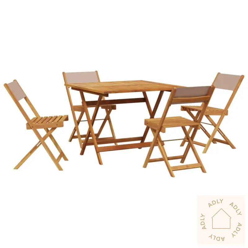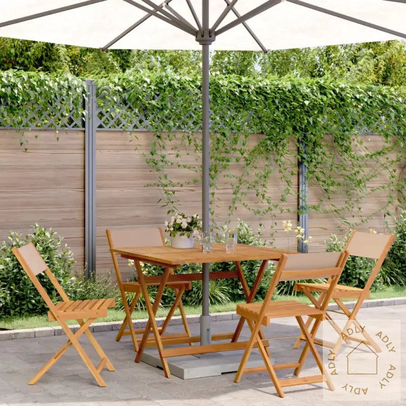 For å beholde det flotte utseendet på dine hagemøbler over tid, anbefaler vi å bruke et vanntett trekk når de ikke er i bruk.Bord:Materiale: Oljebehandlet heltre akasieMål: 90 x 90 x 75 cm (L x B x H)Diameter parasollhull: 5 cm – klargjort for solskjerming på varme dagerSammenleggbar og plassbesparendeHagestol:Farge: Gråbrun, elegant og nøytral som matcher de fleste utemiljøerMaterialer: Solid heltre akasie med oljefinish, slitesterkt polyestertrekk (100% polyester)Samlet mål: 41 x 52,5 x 102,5 cm (B x D x H)Mål sete: 38 x 35 cm (B x D)Setehøyde: 44 cm fra bakkenMaksimal lastekapasitet per sete: 110 kg, robust nok for daglig brukPute inkludert: Nei, men sittekomforten er god også uten puteMontering: Enkel montering krevesLeveransen inkluderer:1 x hagebord4 x hagestoler