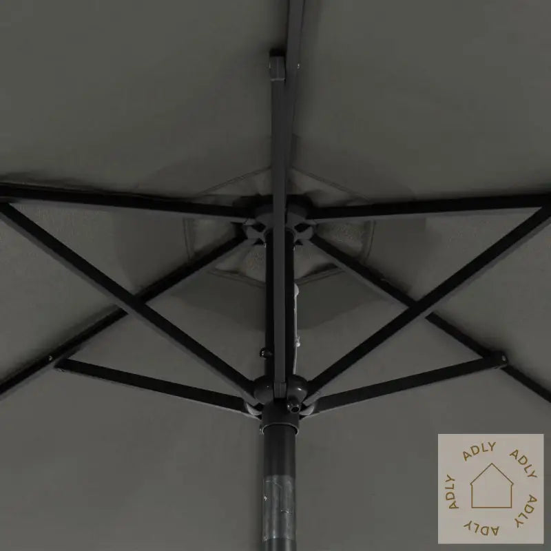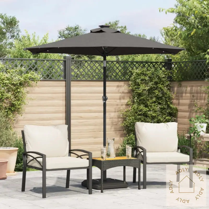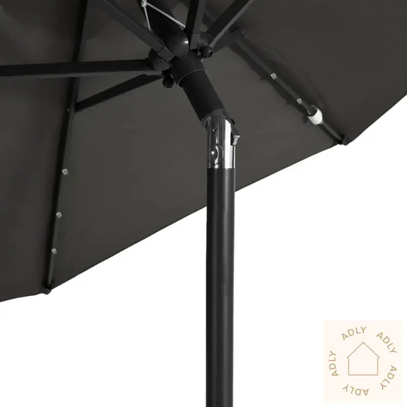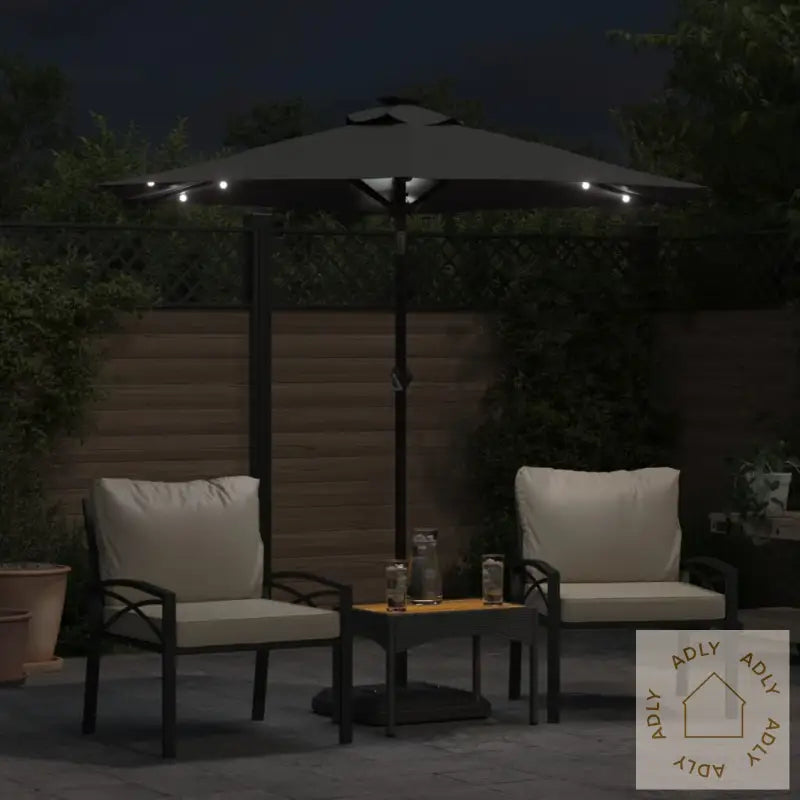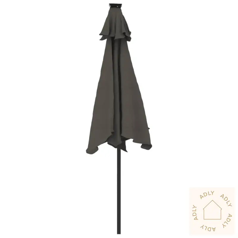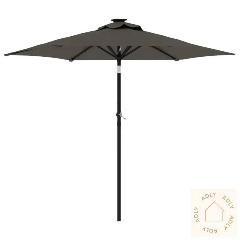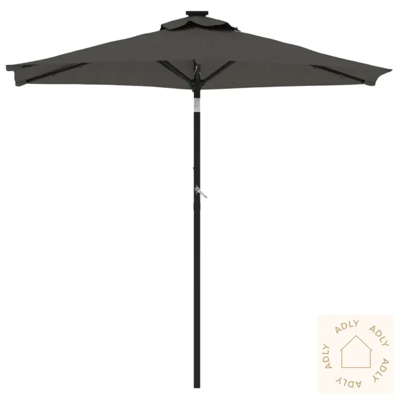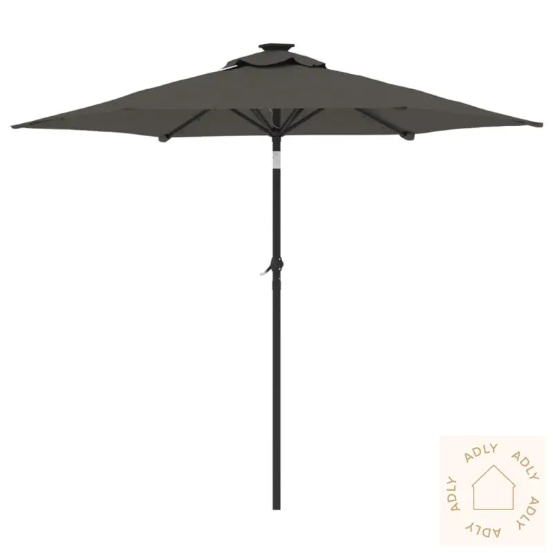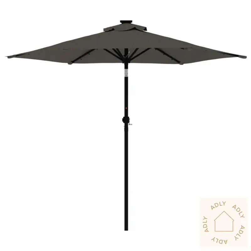 Dette produktet er ikke et leketøy! Pass på at barn ikke bruker parasollen, markisen eller underlaget til lek eller klatring.Unngå bruk av åpen ild, som hagegrill eller kullgrill, under eller rett ved siden av parasollen for å forhindre brannfare.Parasollen er ikke helt vanntett. For bedre beskyttelse mot vann anbefales det å behandle duken med en vanntett spray, spesielt hvis du bruker parasollen mye på regnværsdager.Farge: antrasittMaterialer: stoff (100% polyester), stålMål: 225 x 225 x 212 cm (L x B x H)Diameter stang: 38 mmMed sveivesystemVippefunksjonMed 3 LED-lys på hver ribbeMontering kreves: ja