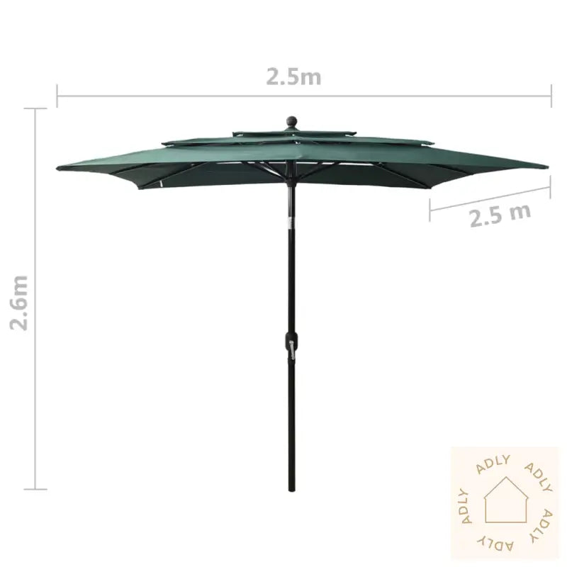Farge: grønnMaterialer: polyester, pulverlakkert aluminiumSamlet mål: 250 x 250 x 260 cm (B x D x H)Diameter stang: 48 mmInkluderer 8 aluminiumsspiler