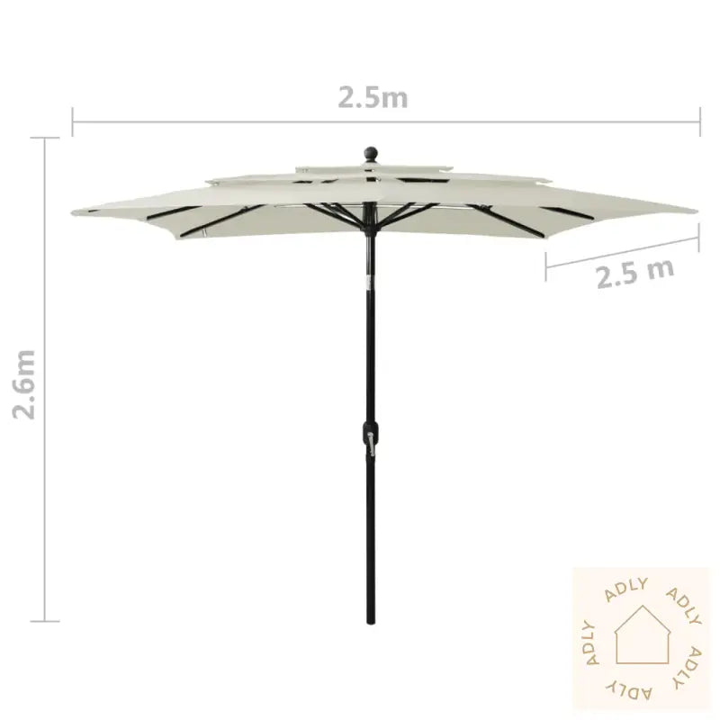 Farge: sandMaterialer: polyester, pulverlakkert aluminiumSamlet mål: 250 x 250 x 260 cm (B x D x H)Diameter stang: 48 mmInkluderer 8 aluminiumsspiler