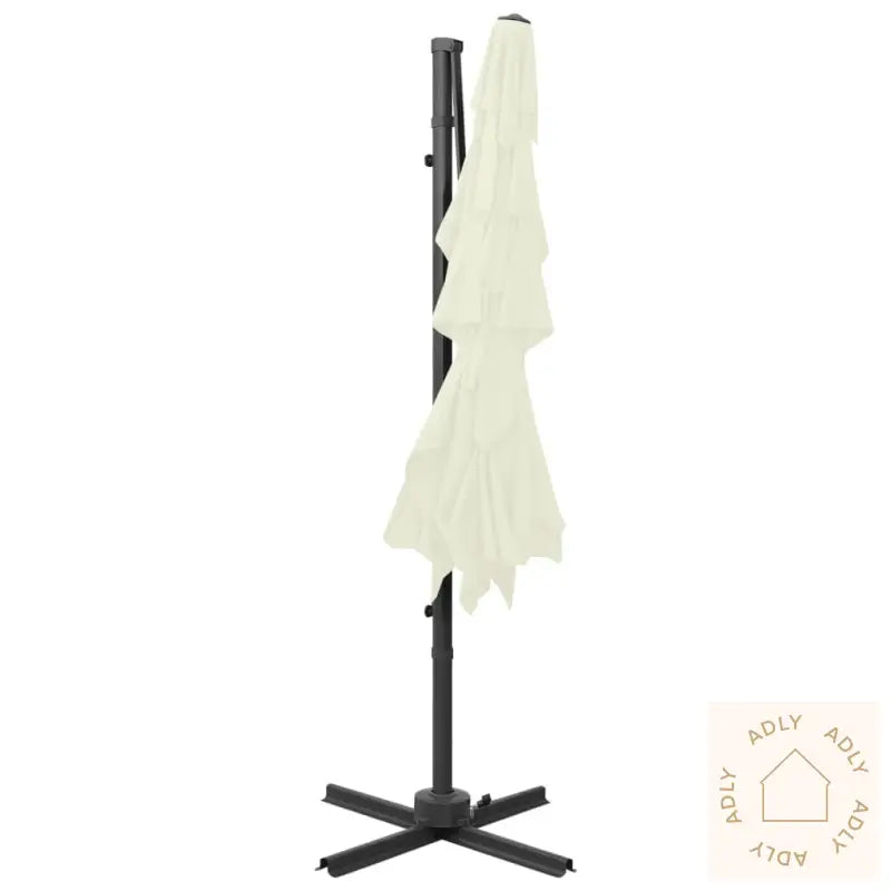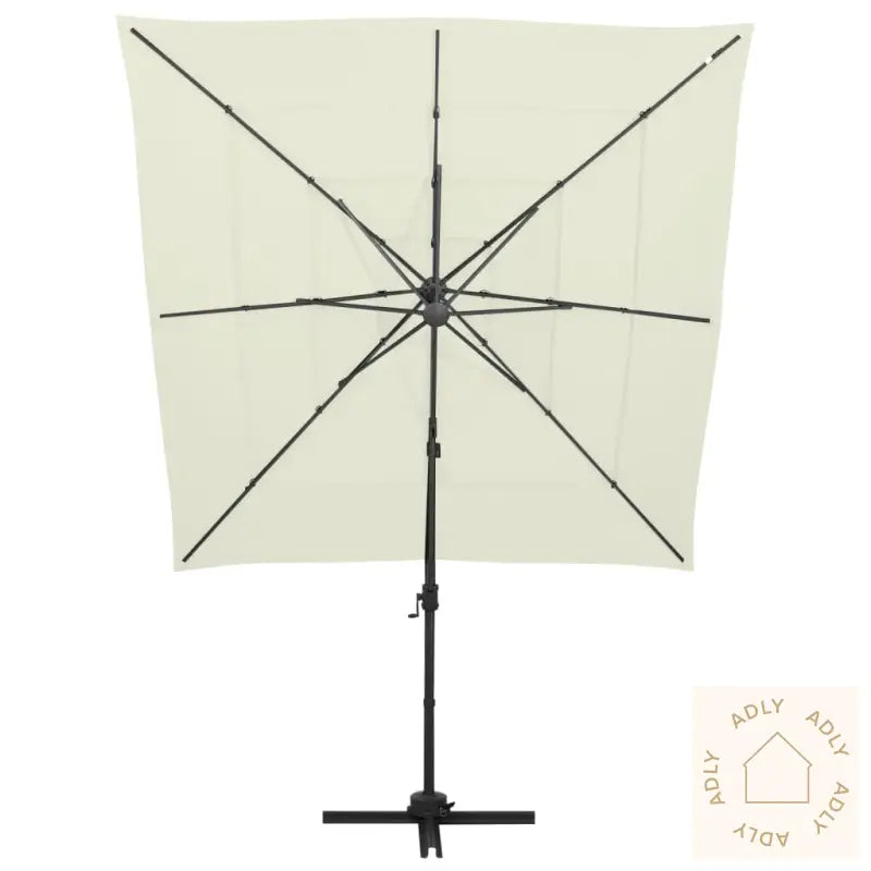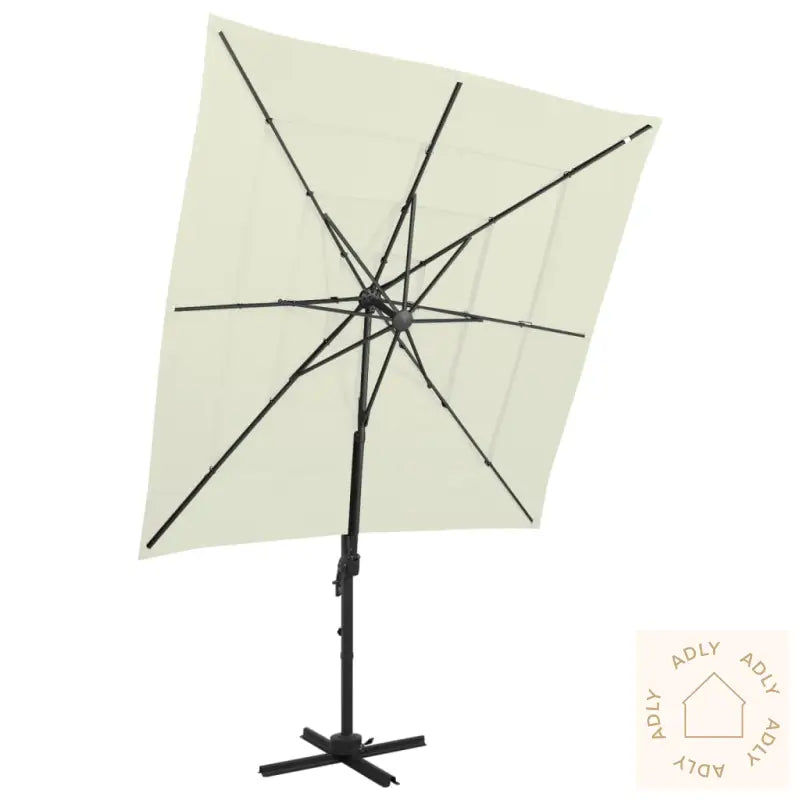 Farge: sand – passer perfekt med mange ulike typer hagemøblerMaterialer: slitesterk polyester og pulverlakkert aluminium for ekstra holdbarhetSamlet mål: 250 x 250 x 246 cm (B x D x H), gir god dekning for både små og store grupperMål kryssfot: 100 x 100 cm (L x B) for ekstra stabilitetInkluderer 8 solide aluminiumsspiler for økt robusthet og lang levetid