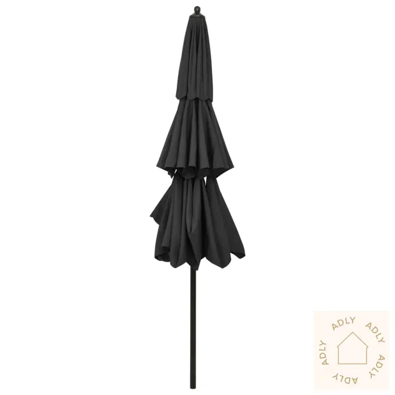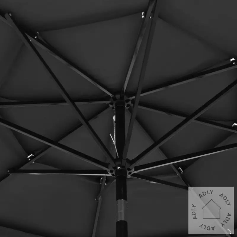 Farge: Antrasitt – passer lett sammen med de fleste bokhyller og stående hyller eller andre utemøblerMaterialer: Polyester og pulverlakkert aluminium for ekstra holdbarhetSamlet mål: 300 x 243 cm (Diameter x H) – gir skygge til flere personer eller større utegrupperDiameter stang: 38 mmInkluderer 8 solide aluminiumsspiler for ekstra støtte og styrke