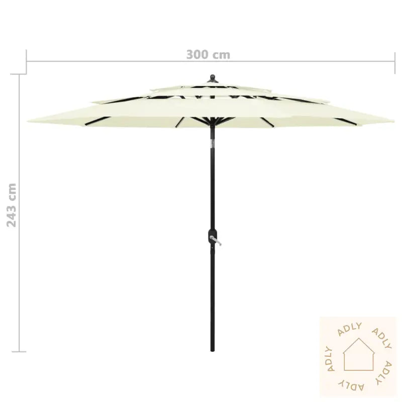 Farge: sandMaterialer: polyester, pulverlakkert aluminiumSamlet mål: 300 x 243 cm (Diameter x H)Diameter stang: 38 mmInkluderer 8 aluminiumsspiler