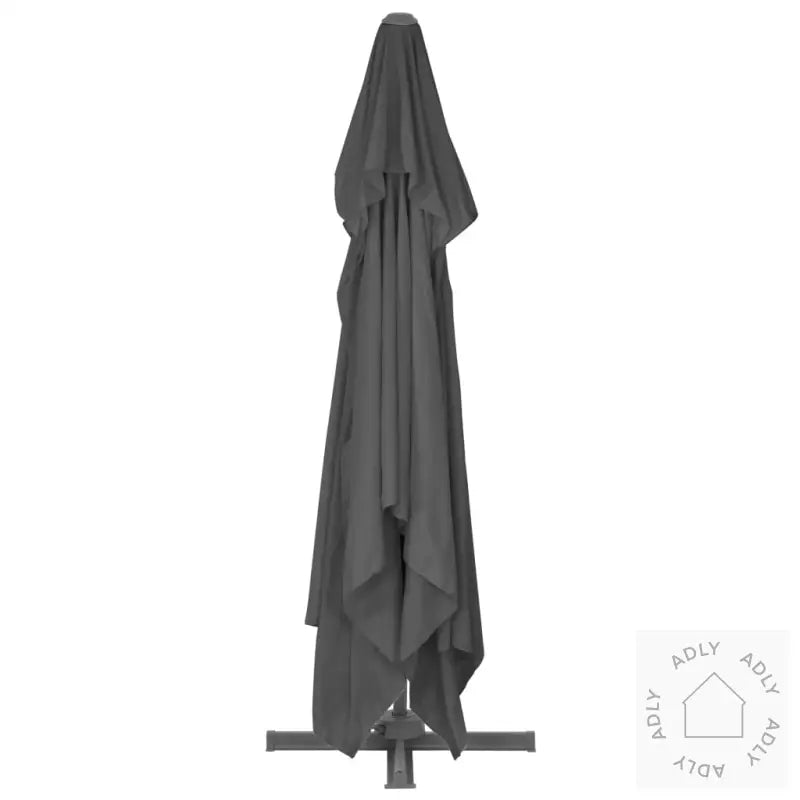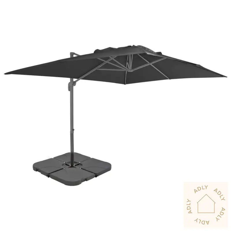 Parasoll:Farge: antrasittMål: 4 x 3 x 2,68 m (L x B x H)Materialer ramme: aluminium + stålInkluderer sveivhåndtak for enkel betjeningMed solid kryssbase av stålEkstra parasollbase:Farge: svartMateriale: plastMål hver seksjon: 50 x 50 x 7,5 cm (L x B x H)Kan fylles med vann eller sandKapasitet per del: 15 LFire deler totaltUniversalt kompatibel med kryssføtter