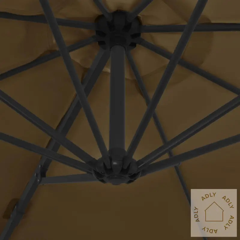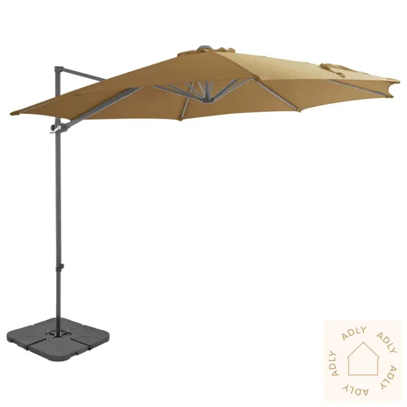 Parasoll:Farge: gråbrunMål: 3 x 2,55 m (Diameter x H)Materialer ramme: aluminium + stålInkluderer sveivhåndtak for enkel åpning/lukkingMed robust kryssbase av stål for ekstra stabilitetEkstra parasollbase:Farge: svartMateriale: plastMål hver seksjon: 50 x 50 x 7,5 cm (L x B x H)Kan enkelt fylles med vann eller sandKapasitet per del: 15 LBestår av fire deler for fleksibel plasseringPasser til alle typer kryssføtter