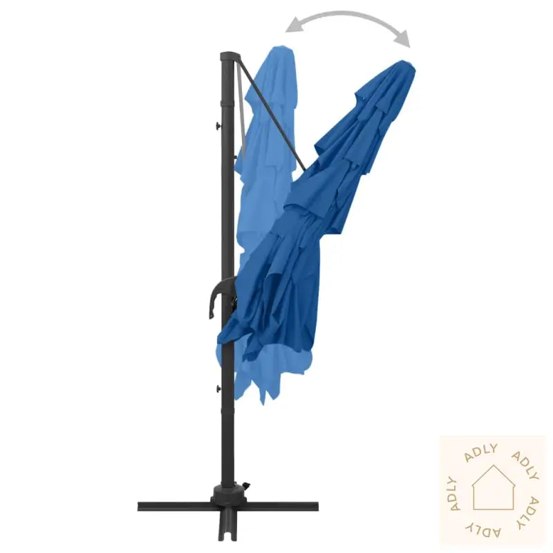 Farge: asurblåMaterialer: polyester, pulverlakkert aluminiumSamlet mål: 250 x 250 x 246 cm (B x D x H)Mål kryssfot: 100 x 100 cm (L x B)Inkluderer 8 aluminiumsspiler