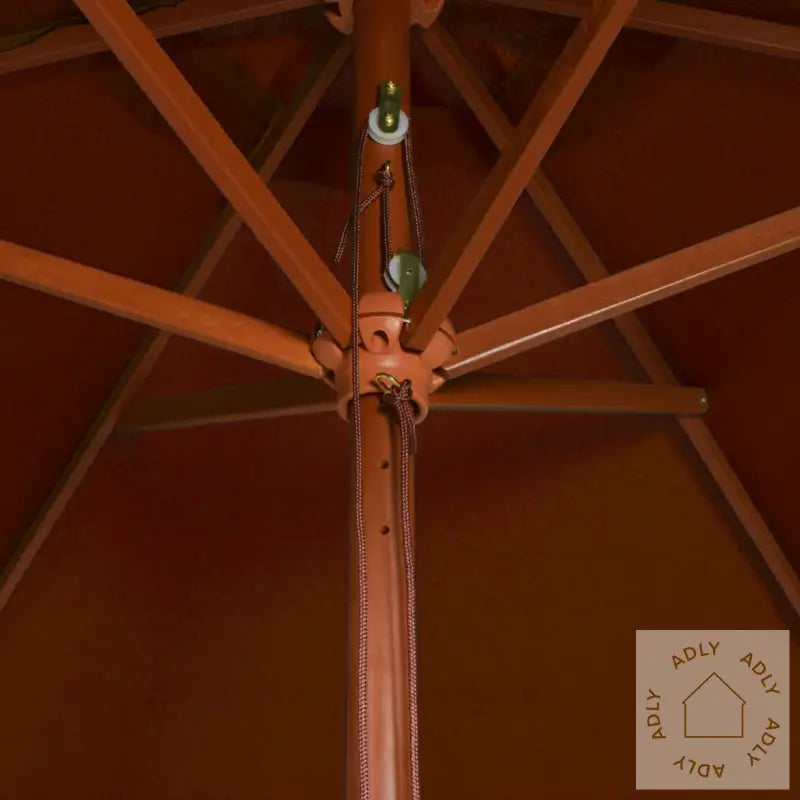 Parasollskjermen er laget av UV-beskyttende og anti-falmende polyester, som ikke bare tåler sterk sol over tid, men også er lett å holde ren – alt du trenger å gjøre er å tørke over stoffet med en fuktig klut. Dette gir deg optimal beskyttelse og lang levetid på produktet. Stangen på 38 mm i diameter gjør det enkelt å montere parasollen både på eksisterende baser og i bord med midthull. Den sterke trestangen av laminert bambus og løvtre, kombinert med seks solide spiler, gir stabilitet selv på vindfulle dager, slik at du kan føle deg trygg.