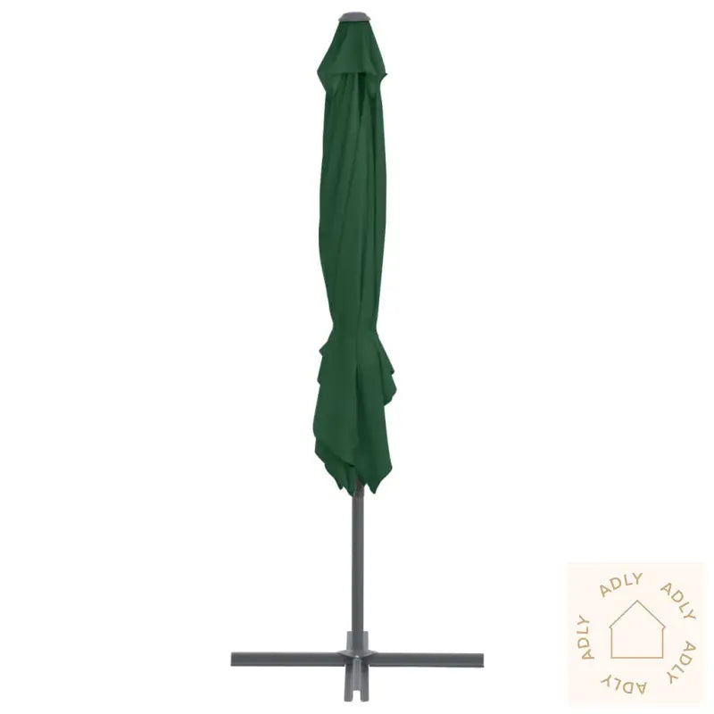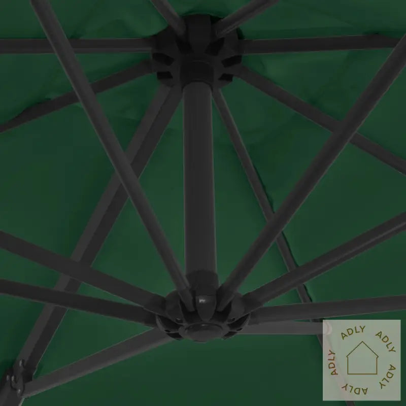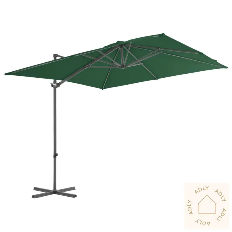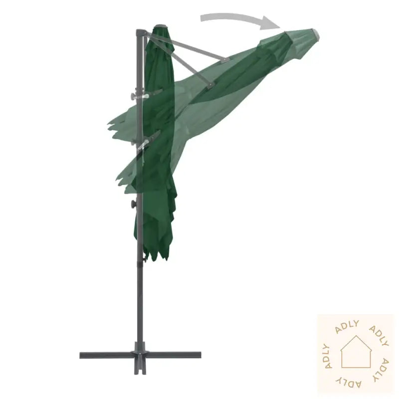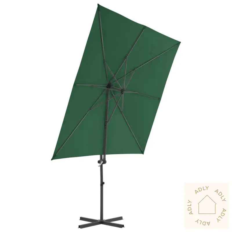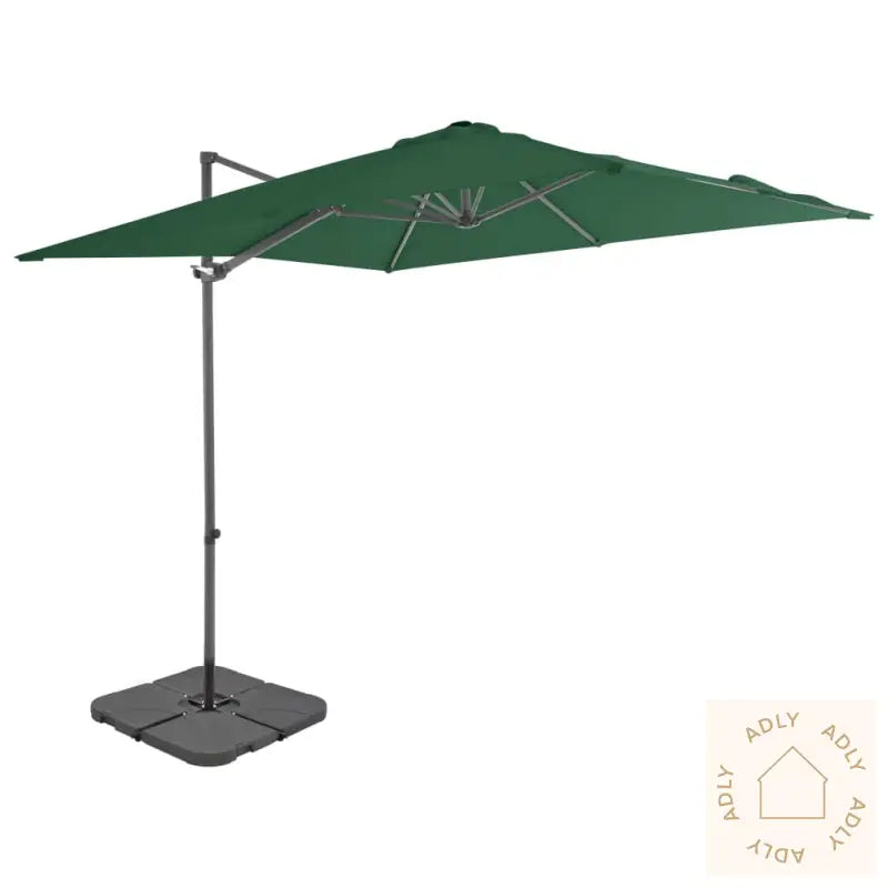 Parasoll:Farge: grønnMål: 2,5 x 2,5 x 2,47 m (L x B x H)Materialer ramme: aluminium + stålInkluderer et sveivhåndtakMed kryssbase av stålEkstra parasollbase:Farge: svartMateriale: plastMål hver seksjon: 50 x 50 x 7,5 cm (L x B x H)Kan fylles med vann eller sandKapasitet på hver del: 15 LBestår av fire delerPasser for alle typer kryssføtter
