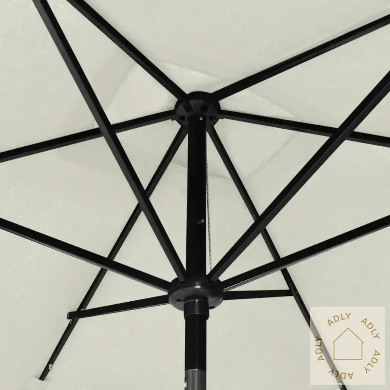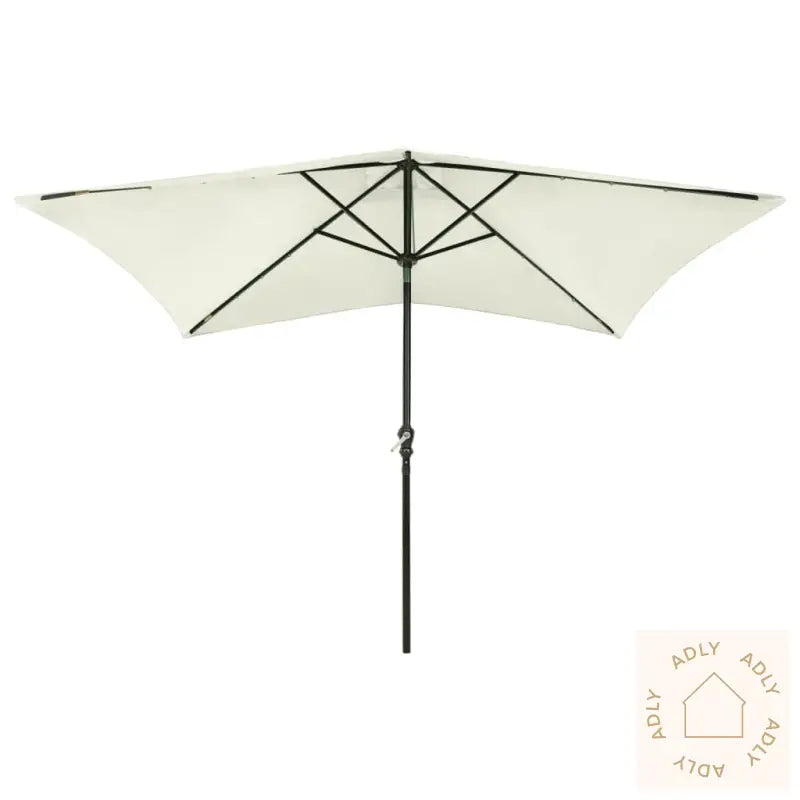 Parasollen er laget av polyesterstoff som både gir godt UV-beskyttelse og holder fargen over tid, så den ser lekker ut år etter år. Den solide stangen og de kraftige spilene er laget av pulverlakkert stål, noe som gir stabilitet selv når det blåser litt.