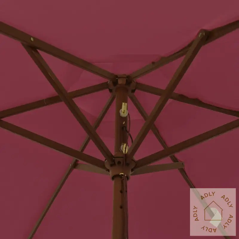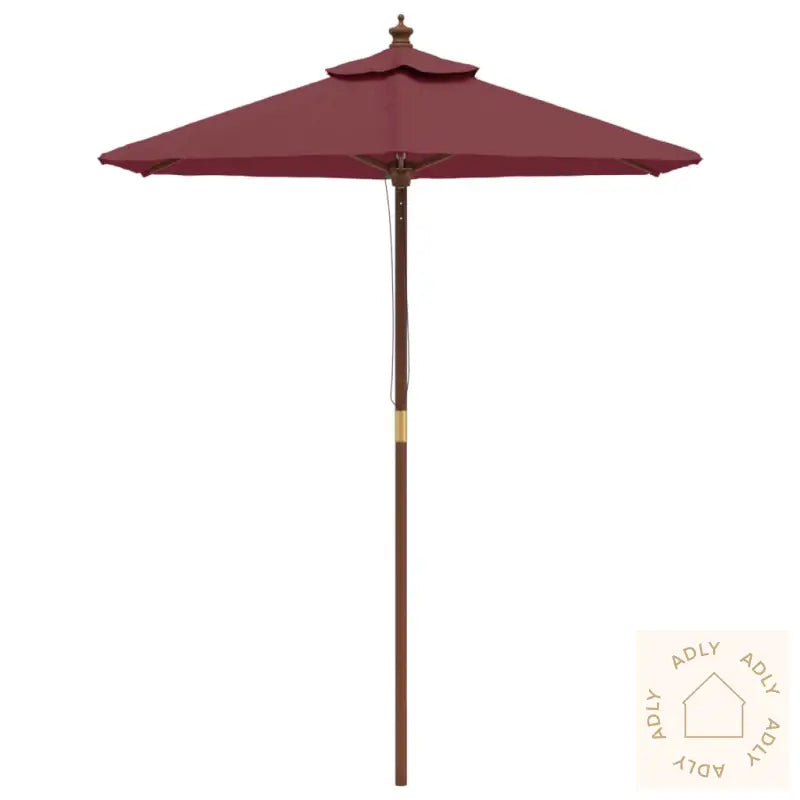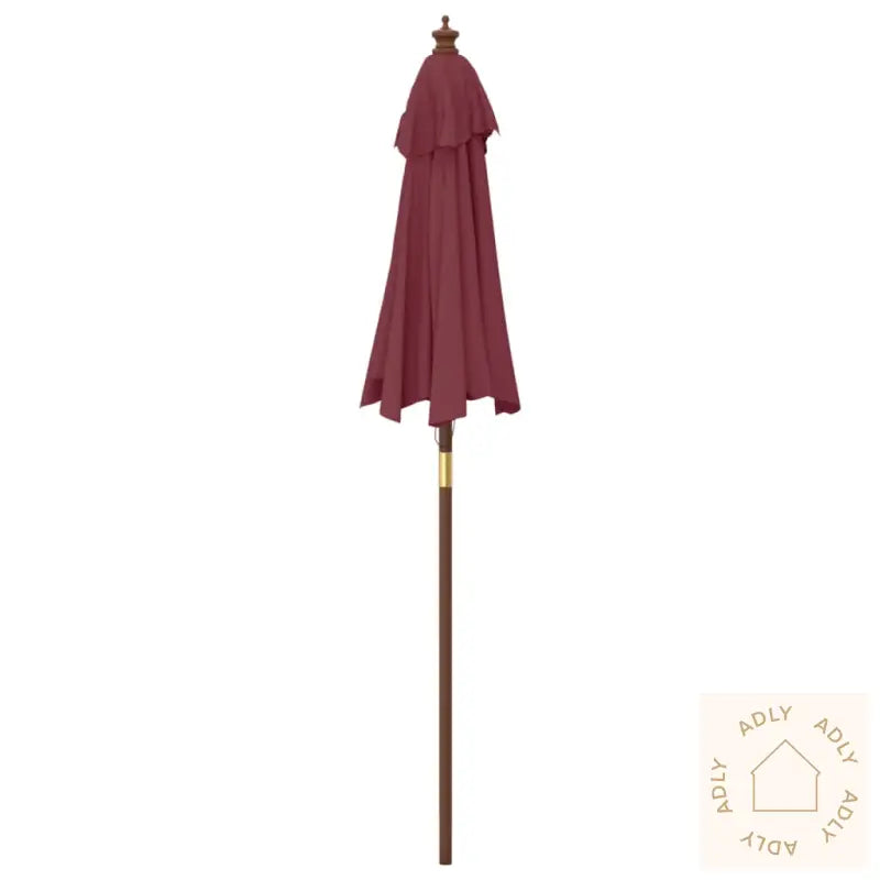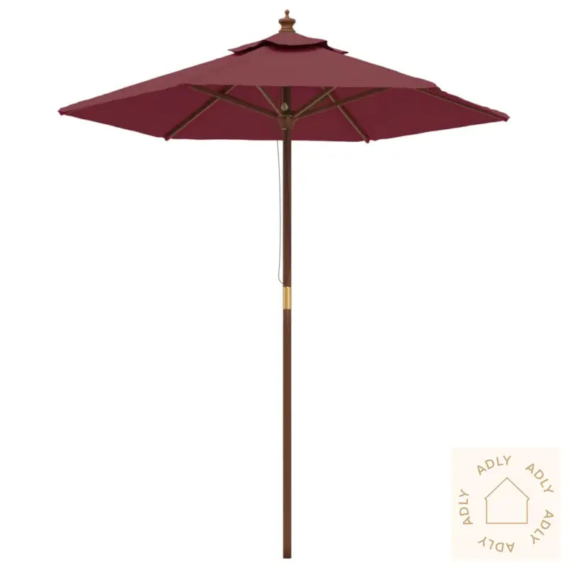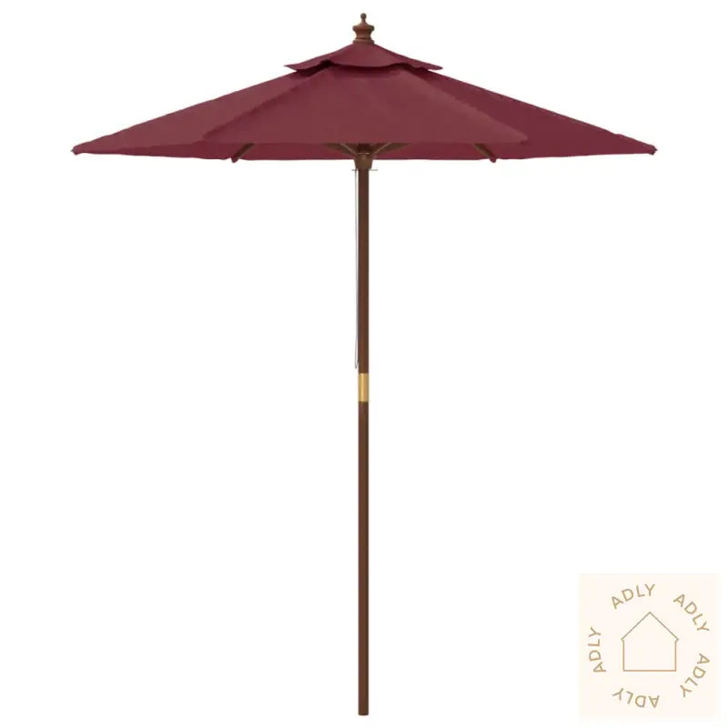 Dette produktet er ikke 100% vanntett. For bedre vannmotstand anbefaler vi å bruke vanntett spray før du setter parasollen ut over lengre tid.Farge: Vinrød – gir et moderne og elegant uttrykk til uterommetMaterialer ramme: Massivt løvtre med teakfarge, laminert bambusMateriale trekk: Stoff (100% polyester)Samlet mål: 196 x 231 cm (Diameter x H)Diameter stang: 38 mmMed luftventilasjon i toppenInkludert 6 spiler som gir ekstra stabilitetUtstyrt med enkelt trinsesystem for rask åpning/lukkingMontering kreves: Ja – lett å sette sammen