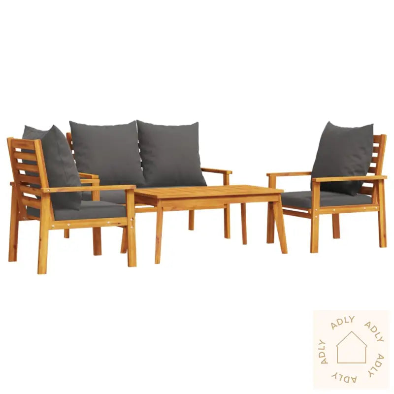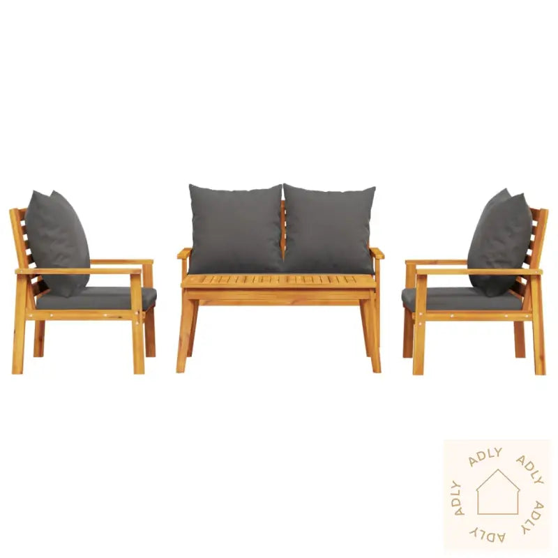Heltre akasie: Hele settet er laget av robust, oljebehandlet akasietre som tåler utendørs bruk og gir god stabilitet. Akasie er et naturmateriale som er motstandsdyktig mot vær og vind, og det vakre treverket skaper en hyggelig og varm atmosfære på uteplassen.Komfortabel sitteopplevelse: Hagestolene og hagebenken er utstyrt med solide armlener og komfortable ryggstøtter, slik at du kan lene deg godt tilbake. Tykt polstrede puter i mørkegrått 100% polyesterstoff gir ekstra komfort, både til setet og ryggen. Putene bidrar til en myk og innbydende følelse, perfekt for lange sommerkvelder utendørs.Praktisk bordplate: Hagebordet har en plate i slitesterk, oljebehandlet heltre akasie som er enkel å holde ren – bare tørk over med en fuktig klut og det ser bra ut igjen.Allsidig bruk: Med klassiske mål passer dette settet like godt på en liten veranda som på en stor terrasse, bakgård, hage eller plen. Møblene er fleksible og gir mange muligheter for ulike uteområder.Godt å vite: